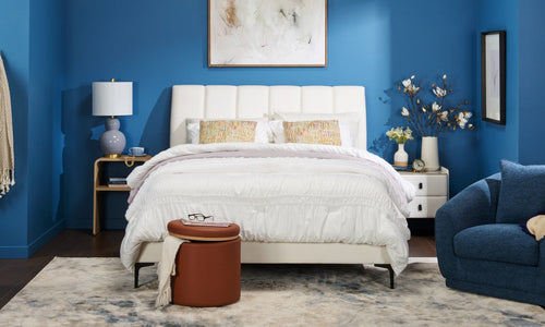 Deep blue walls meet crisp white bedding for a bedroom that’s both striking and serene.