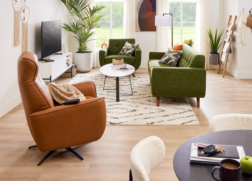 A bright white canvas brought to life with leafy greens, warm leather, and bold black-and-white accents—tailored for stylish, everyday living.