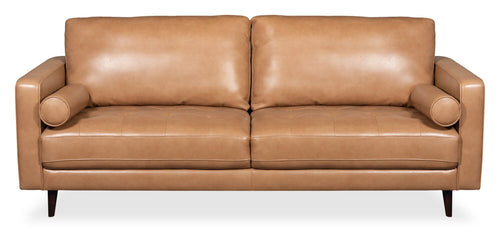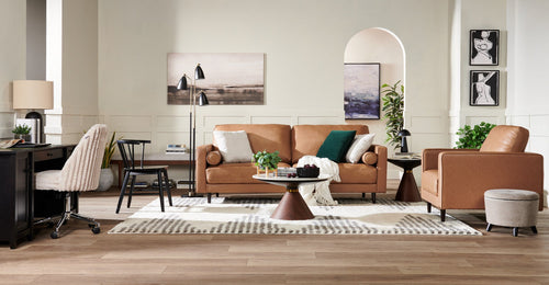Warm brown leather meets clean Scandinavian lines for cozy, modern living.