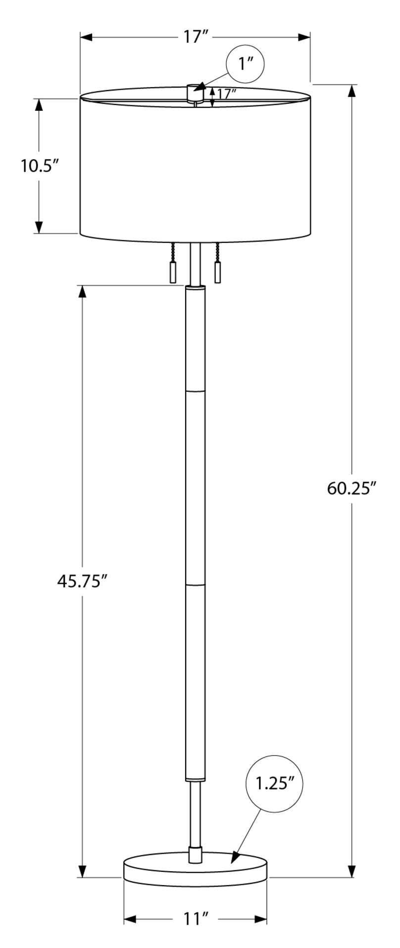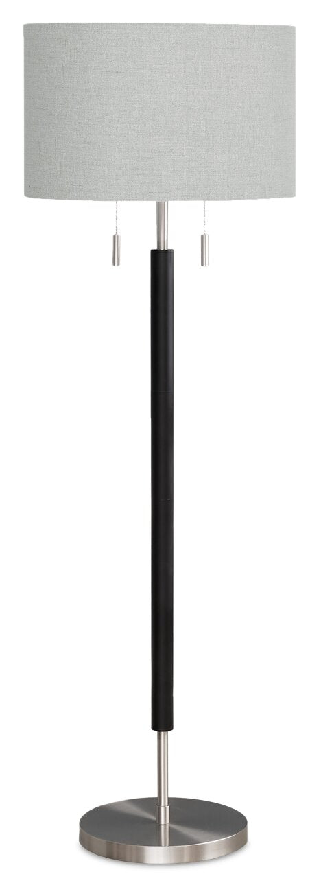 Enliven your space with this modern and sophisticated 60"h floor lamp in black and nickel metal with a chic grey fabric shade. Under the drum shade, this lamp has 2 light sockets that can house two 60W bulbs each (not included) to illuminate a room. The double on/off pull chain switch helps to easily adjust the lighting to your desired ambiance, whether you're looking to brighten up a room or create a cozy atmosphere. Easy to assemble and use right away and a 2-year limited warranty is included against any defects for your satisfaction. Bring this decorative accent floor lighting into a living room, bedroom, or office for some contemporary styling and functional lighting!