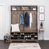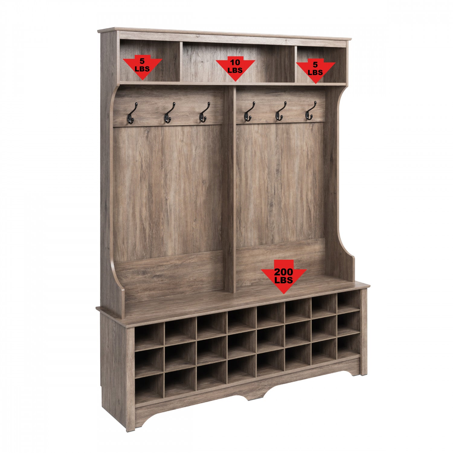 Organize and style your entryway with the Prepac 60 in. Wide Hall Tree. Standing at 77 in. tall and 60 in. wide, this hall tree will provide all the storage space needed for your entryway belongings. Store your larger items in the 3 upper compartments, and hang your jackets, scarves, purses and hats on the 6 strong double coat hooks. A wide bench, with plenty of room, sits on top of 24 individual shoe cubbies. Each shoe cubby is spacious enough to hold a pair of size 13 men's shoes, keeping them neatly stored and out of the way. The Prepac Hall Tree's sleek design fits in with all decors and provides the essential storage space you need.