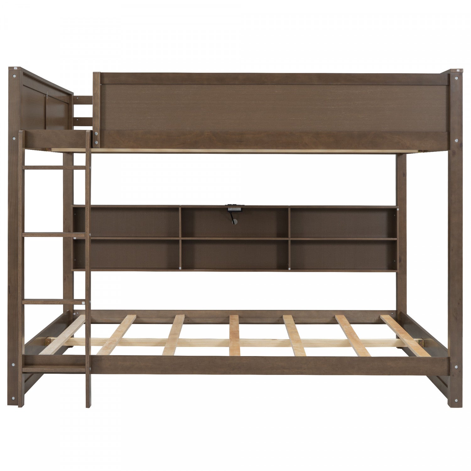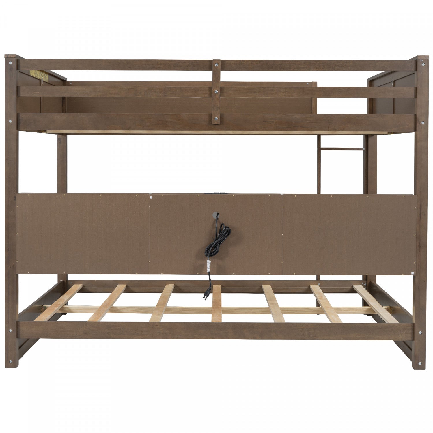 Maximize space without sacrificing style with the queen over queen bunk bed. Made from sturdy pine wood and engineered wood, it features 6 built-in storage cabinets and an integrated charging station with usb ports. The antique wood finish brings a timeless look to any room. Safety guard rails and solid wood slats ensure a secure and stable sleep experience—no box spring required.