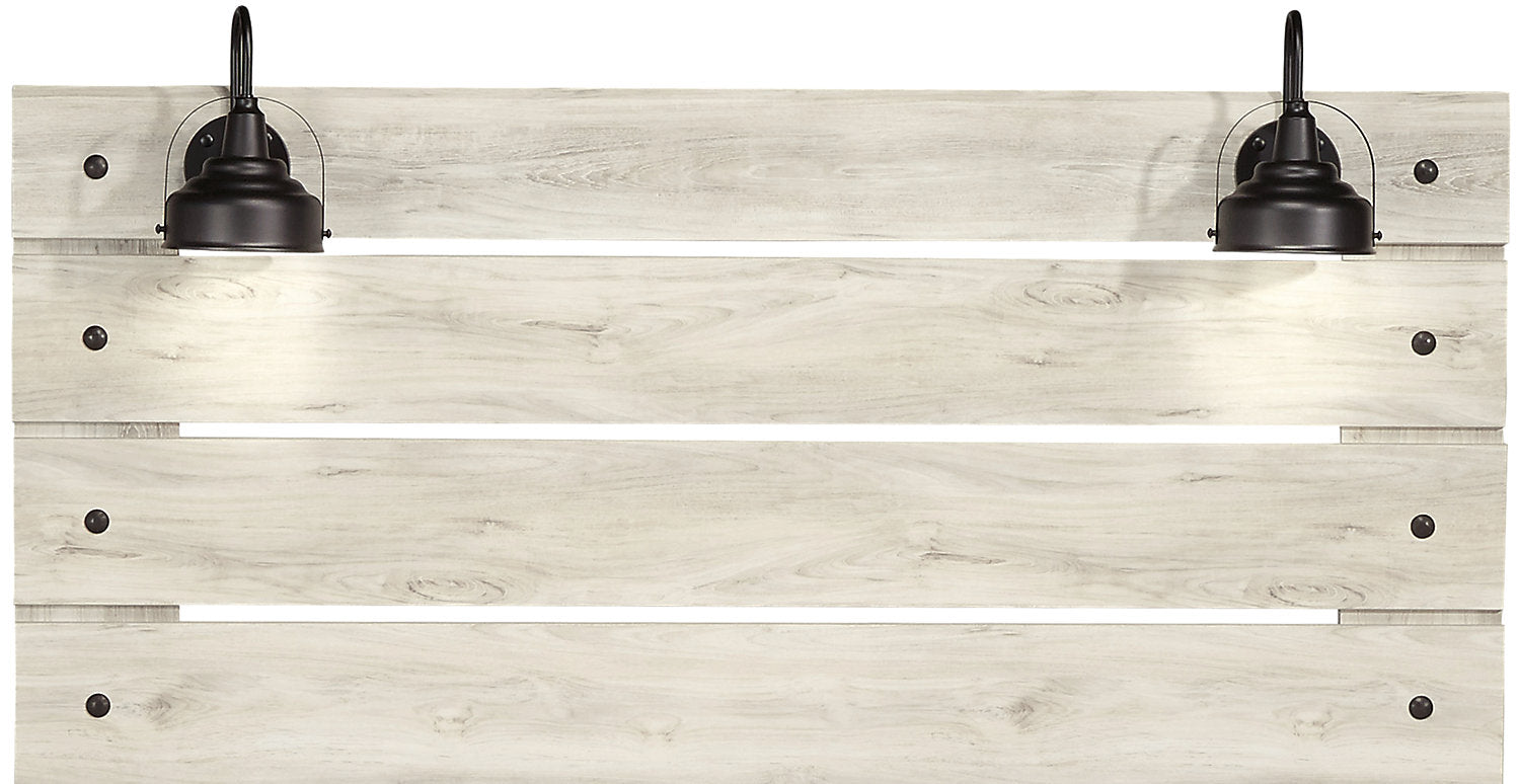 Shine some light on bedtime relaxation with this Abby queen bed. Rustic and industrial styles collide in natural-looking wood with a light white finish and dark metal nailheads. Two LED-powered sconce lights built into the headboard provide some extra illumination for when you want to stay up late and read just one more chapter. A pair of USB ports means that you'll never have to worry about your phone dying in the middle of the night again. Three slats with matching support legs make sure you're comfortably supported all night long. Curl up on the Abby tonight, and let some light into your dreams.
