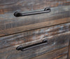 | Hardware | Long, dark metal handles decorate the front of the drawers. |