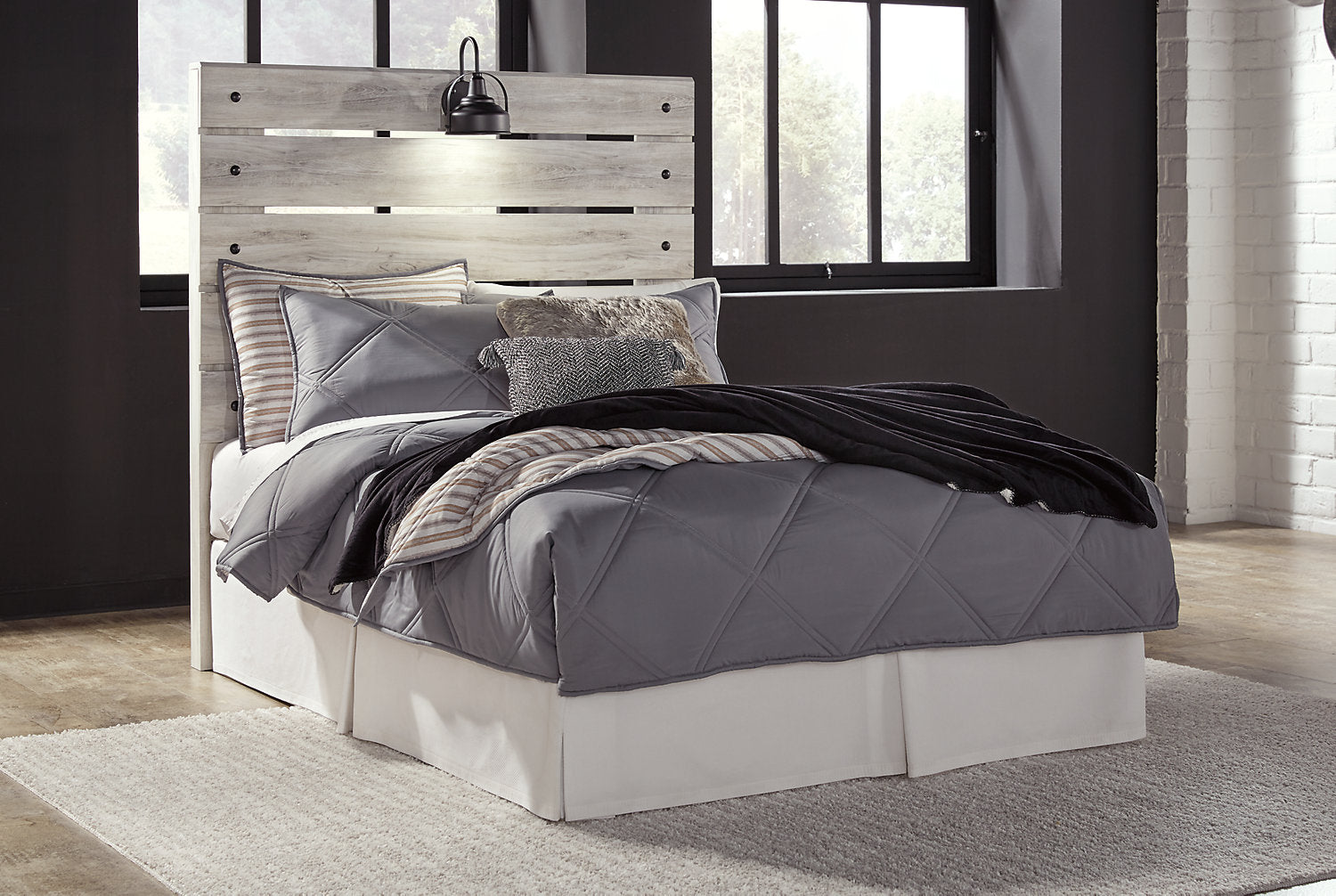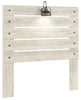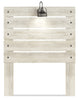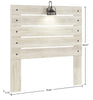 Shine some light on bedtime relaxation with this Abby full headboard. Rustic and industrial styles collide in natural-looking wood with a light white finish and dark metal nailheads. An LED-powered sconce light built into the headboard provides some extra illumination for when you want to stay up late and read just one more chapter. A pair of USB ports means that you'll never have to worry about your phone dying in the middle of the night again. Curl up with the Abby tonight, and let some light into your dreams.