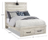 Shine some light on bedtime relaxation with this Abby full storage bed. Rustic and industrial styles collide in natural-looking wood with a light white finish and dark metal nailheads. An LED-powered sconce light built into the headboard provides some extra illumination for when you want to stay up late and read just one more chapter. A pair of USB ports means that you'll never have to worry about your phone dying in the middle of the night again. Two drawers built into the footboard give you extra space for clothing or blankets. Curl up on the Abby tonight, and let some light into your dreams.