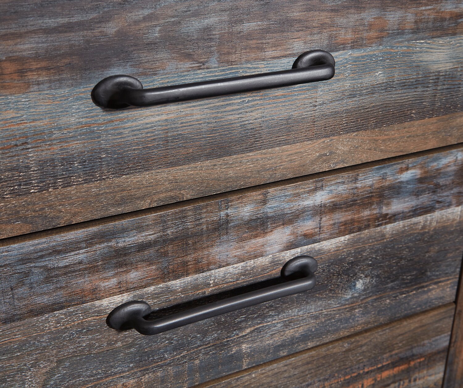 | Hardware | Long, dark metal handles decorate the front of the drawers. |