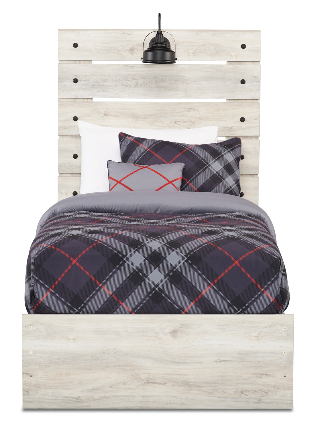 Shine some light on bedtime relaxation with this Abby twin bed. Rustic and industrial styles collide in natural-looking wood with a light white finish and dark metal nailheads. An LED-powered sconce light built into the headboard provides some extra illumination for when you want to stay up late and read just one more chapter. A pair of USB ports means that you'll never have to worry about your phone dying in the middle of the night again. Three slats with matching support legs make sure you're comfortably supported all night long. Curl up on the Abby tonight, and let some light into your dreams.