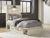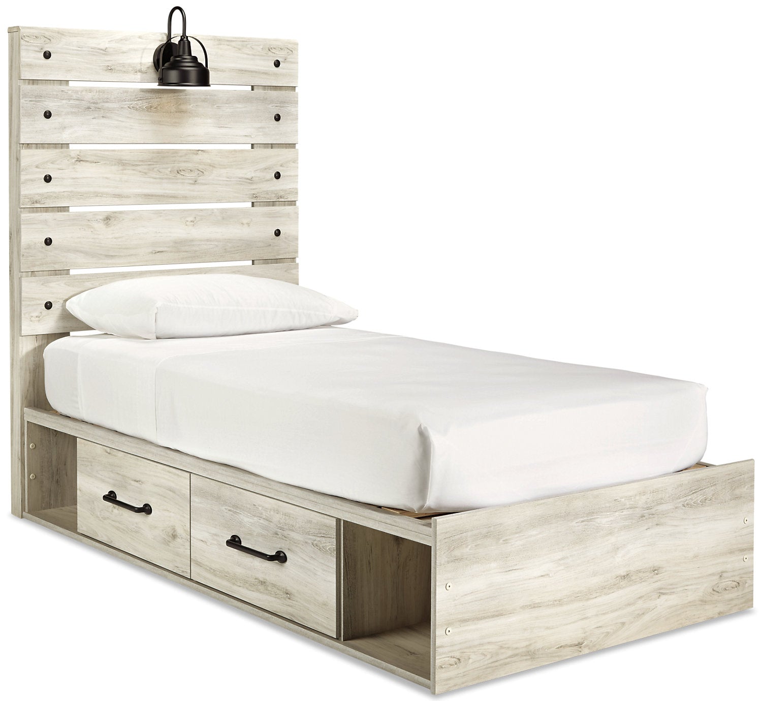 Shine some light on bedtime relaxation with this Abby twin side storage bed. Rustic and industrial styles collide in natural-looking wood with a light white finish and dark metal nailheads. An LED-powered sconce light in the headboard provides some extra illumination for when you want to stay up late and read just one more chapter. A pair of USB ports on the side means you'll never have to worry about your phone dying in the middle of the night again. Each side has two built-in drawers let you keep everything you need right at hand. Curl up on the Abby tonight, and let some light into your dreams.