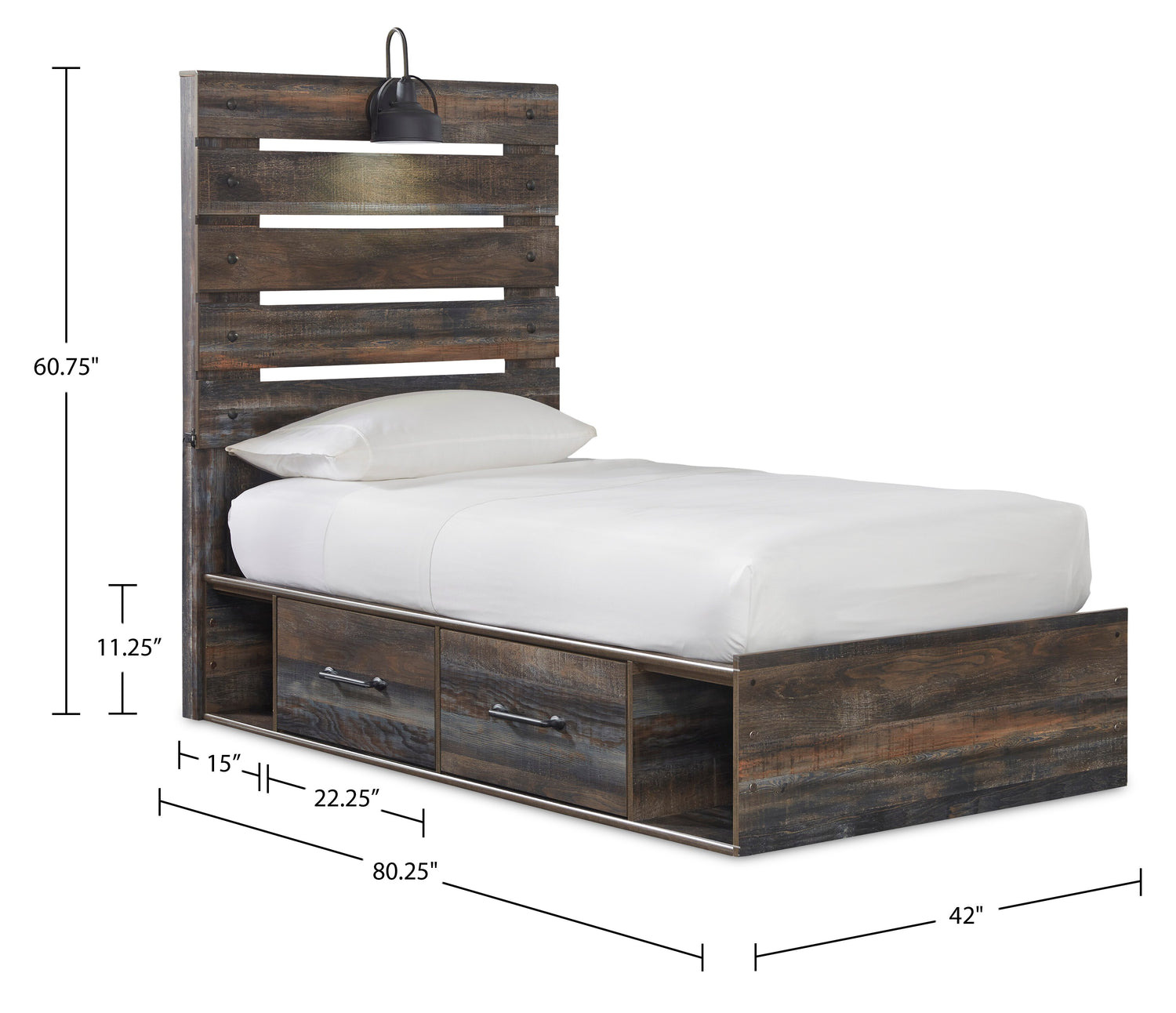 | Storage Options | Four spacious drawers and four open cubbies built into the bed's sides add extra storage space to your room. |
