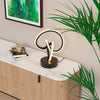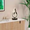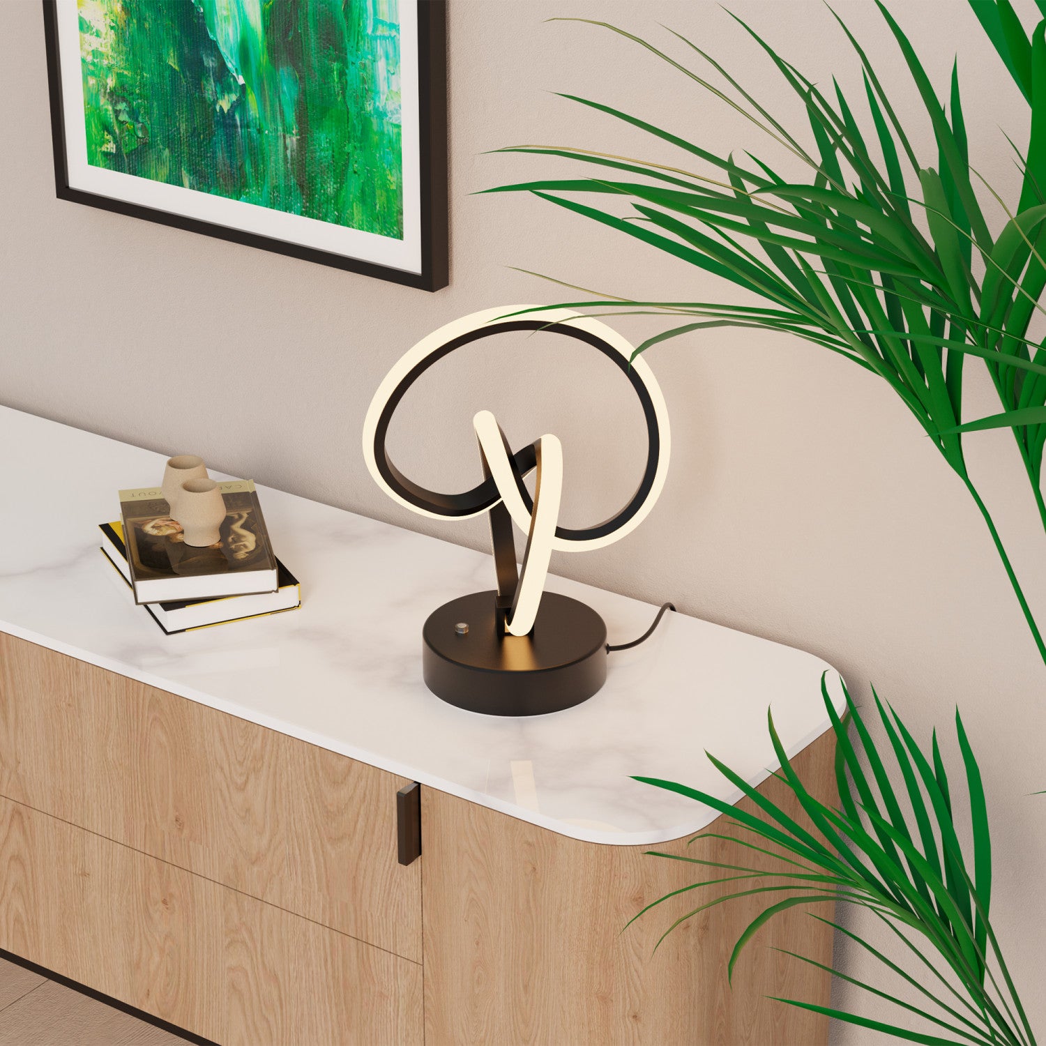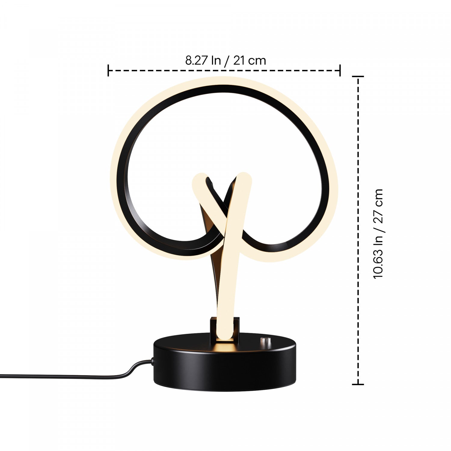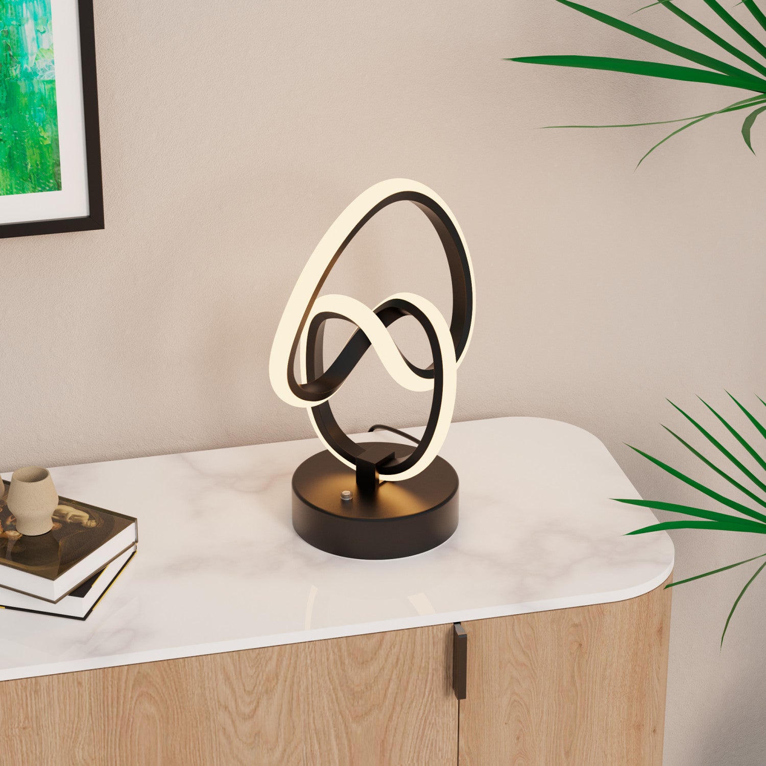 This 11-inch table lamp features abstract interlocking loop design that creates a captivating visual dance. Emitting a soothing 3000k warm light, this lamp adds elegance and a contemporary artistic touch to any tabletop. Its matte black finish and abstract form are sure to draw attention, providing not just illumination but a conversation piece for any modern space.