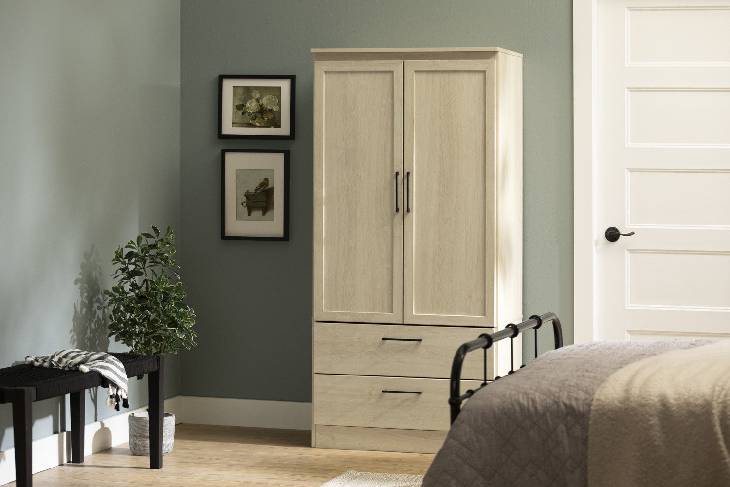 the ingenious compartments in this piece will help ensure you can find what you need easily and your clothes are in good shape. The metal rod means no more creased dresses and shirts. Behind the doors are three storage spaces created by two adjustable shelves, along with a pair of hooks for hanging scarves or neckties. The two roomy drawers can hold socks and underwear. Make sure you have a mirror nearby and you’ll always be well dressed!