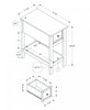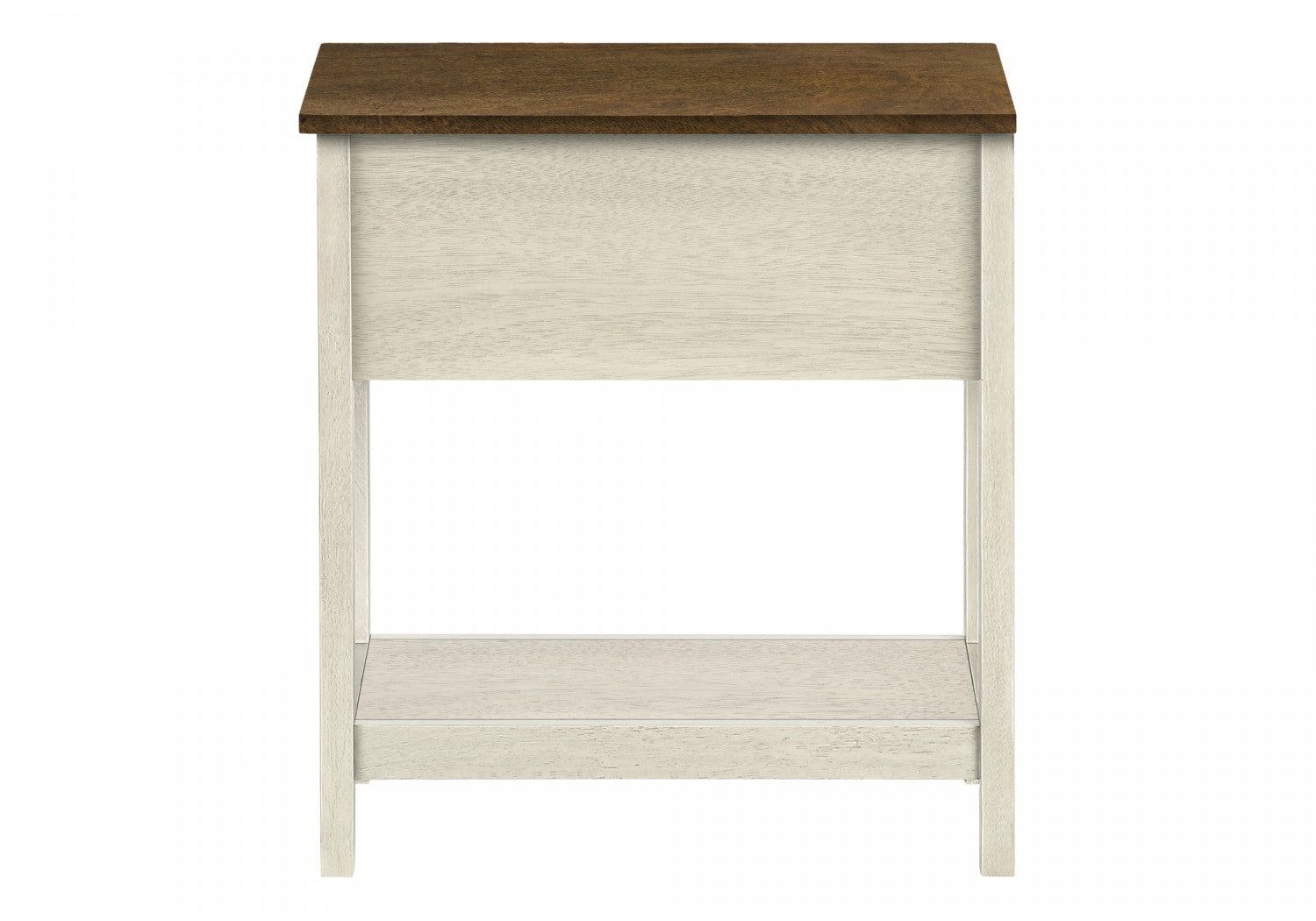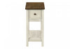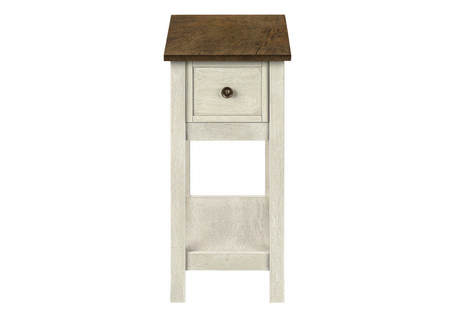 This fashionable and practical 24 inch high accent table is a must-have piece for your home. With a space saving design, this 2 tier side table is perfect for small spaces with its narrow profile to set next to an armchair or sofa in a living room with a small lamp or decorative objects on top, or as a charming nightstand in the bedroom. The two-tone espresso brown and antique white veneer finish with sturdy straight legs brings some warmth to a space. The storage drawer on easy metal glides is accented with a bronze metal knob and the roomy bottom shelf allows you to conveniently keep essentials organized and within reach. Durably designed with quality materials, this practical end table is backed by a 5 year limited warranty against manufacturer's defects for your convenience. Easy to assemble with illustrated instructions, all hardware and floor protectors included so you can have this versatile accent table setup and ready to enjoy.
