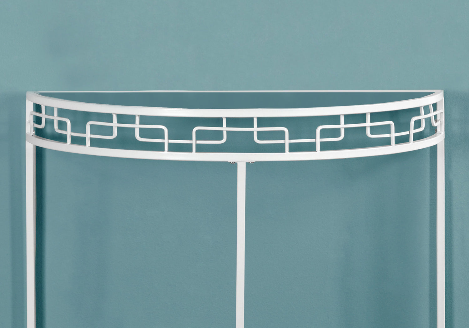 Welcome your guests in style with a half-moon shaped metal console table that will look great as an entryway console table or in your living room. Ideal in small homes, condos or apartments, this accent table is delicately engineered in a white metal frame with a thick tempered glass top with ample space for your decor or other accessories. The geometric design stands out perfectly.