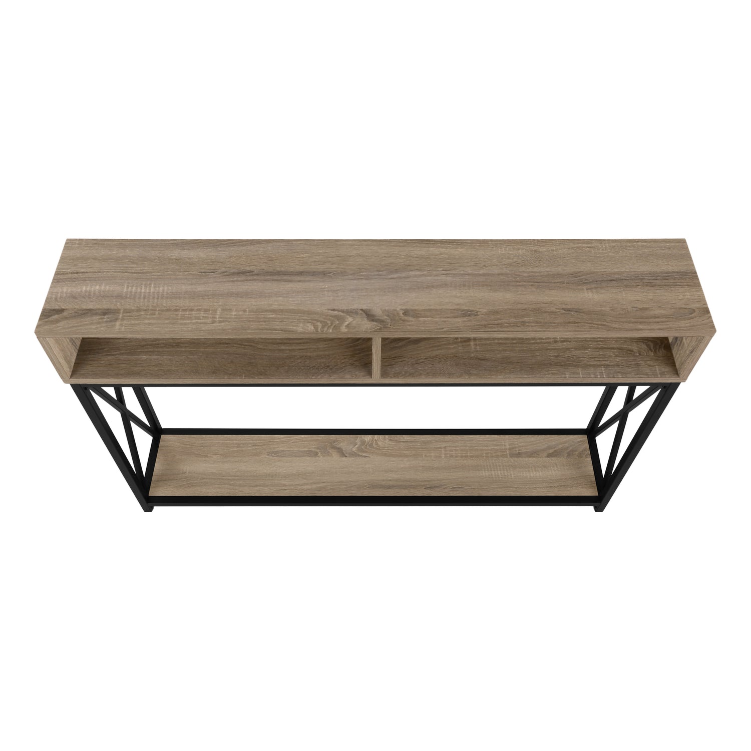 Adding plants, baskets, books or other decor items to the entryway, living room or bedroom? Featuring 2 open shelves, this console table is a stunning combination of taupe wood look tones with a sturdy X-design black metal frame to pair with any style. Also including a bottom panel for additional space, this accent table is your versatile storage solution at a perfect height and compact design to bring an edge to your small home, apartment or condo. It will look fabulous anywhere!