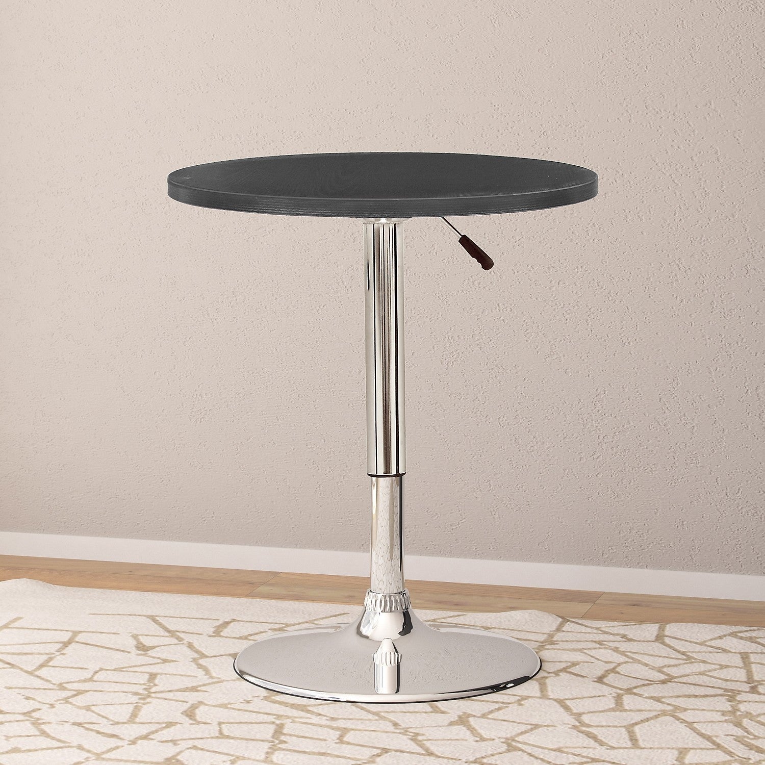 Enjoy the convenient and stylish flair that this adjustable bar table brings to your space. A chrome gas lift – like one on a barbershop chair – allows you to effortlessly adjust the tabletop to different heights. Meanwhile, its wood-finished tabletop adds contemporary style to your decor. Finally, the round table has a small footprint, which frees up space in any room and makes this table the perfect addition to your home.