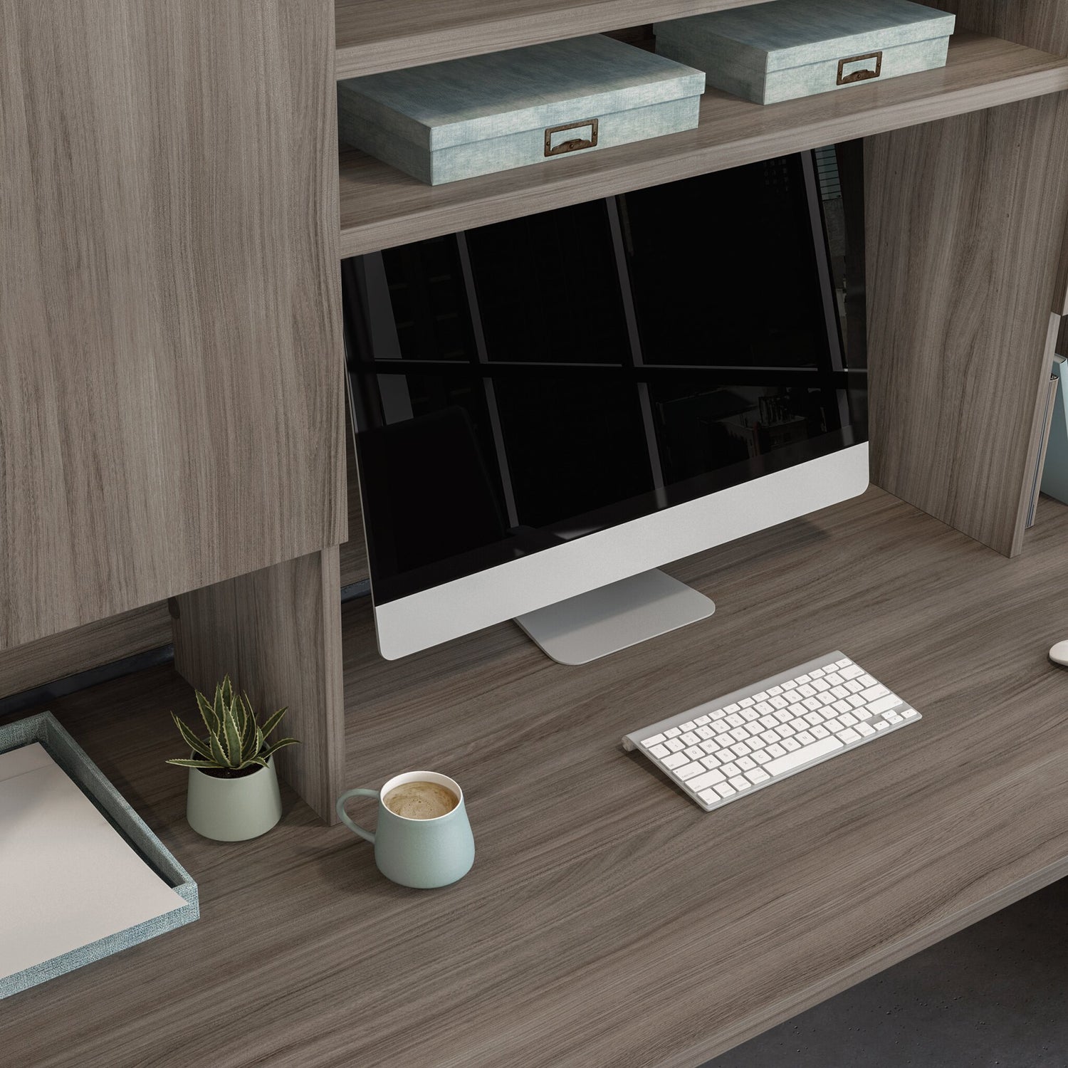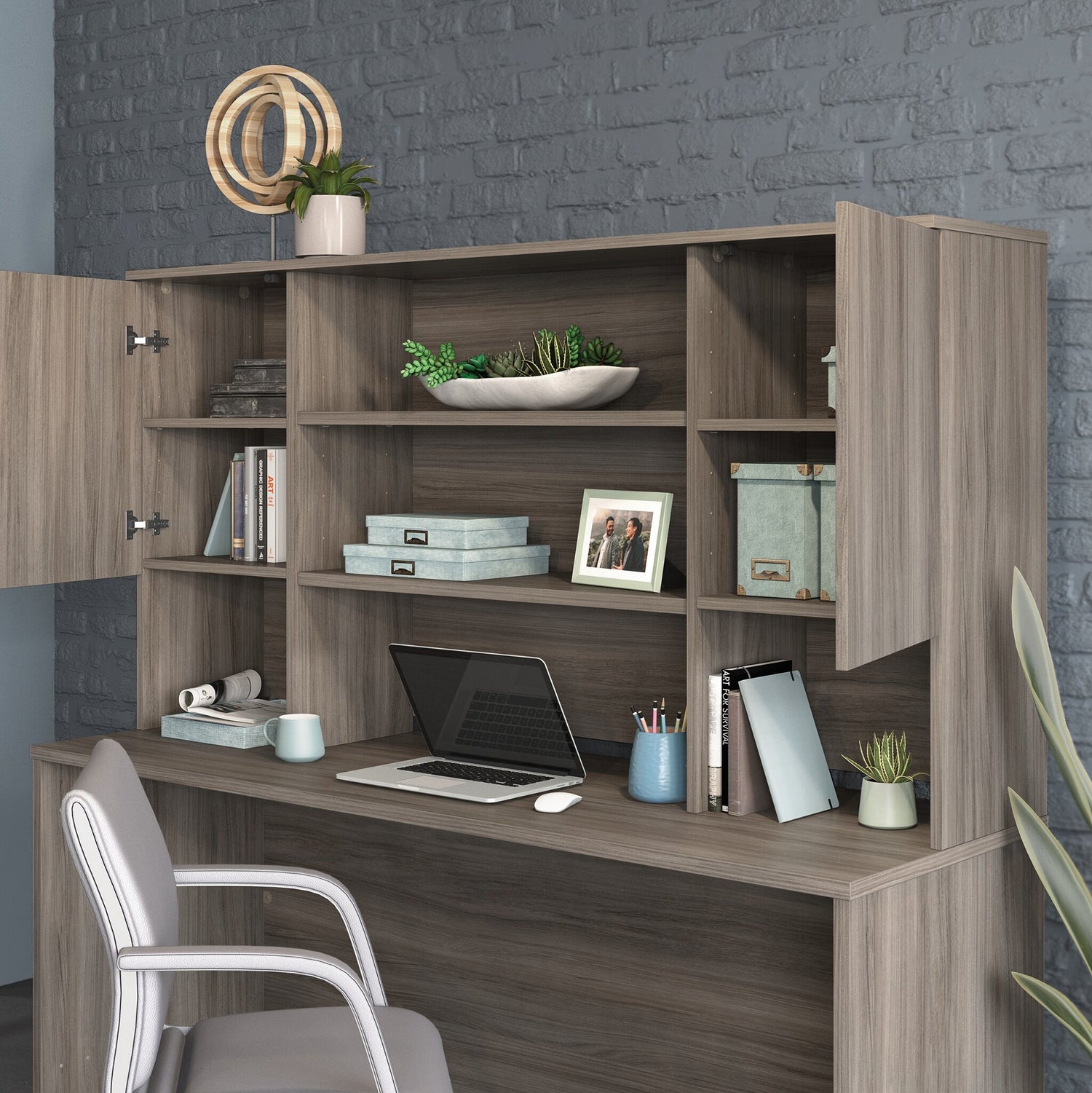 Create a stunning focal point and increase the storage capabilities of your workspace with this Affirm 72" storage hutch. Nestled on the desktop, hutches add just the right amount of functionality to an office without taking up too much room. Keep those stacks of folders at bay thanks to convenient, hidden storage behind its cabinet doors. Meanwhile, two centre shelves allow for the display of decor items. Finished in a neutral grey, combine this office hutch with the compatible Affirm desks (AFFE3DSK, AFFE4DSK) for a stylish, first-rate workspace.