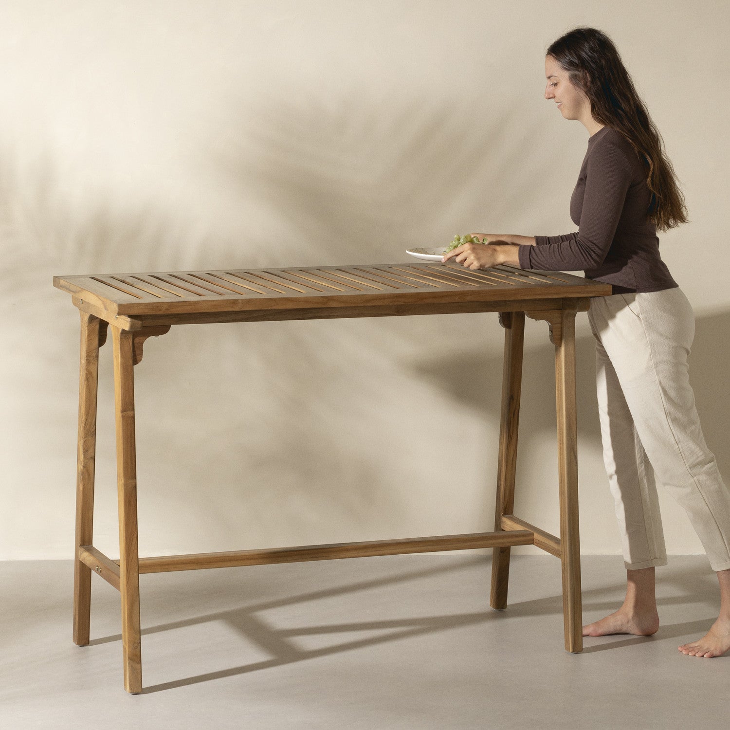 Your patio wouldn't be complete without a space to host friends and family to eat! Choose this resplendent teak wood bar table. This species of tree, native to Asia, is renowned for its natural finish and durability. It is frequently chosen for outdoor furniture because of its ability to withstand the elements. Protected by a waterproof coating, you can be sure that rain and sun won't get the better of it. This bar-height patio table made entirely of teak wood is a must-have for all lovers of bohemian harmony style. Add a few barstools from the same collection for a breathtaking look. This trend's mix of handcrafted objects, greenery and varied patterns will awaken warmth and softness in your space. To keep the wood intact over time, we recommend oiling it every year.