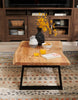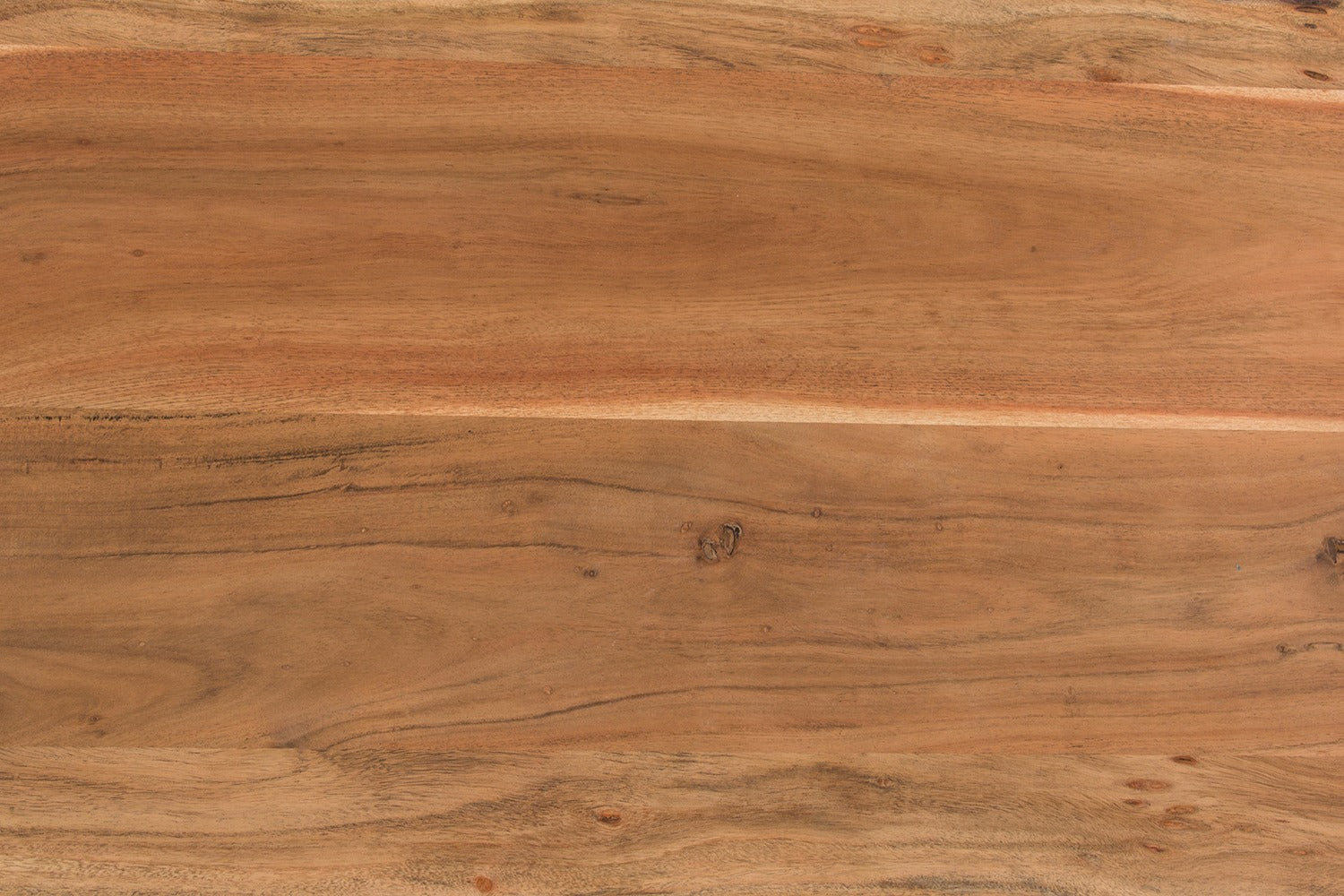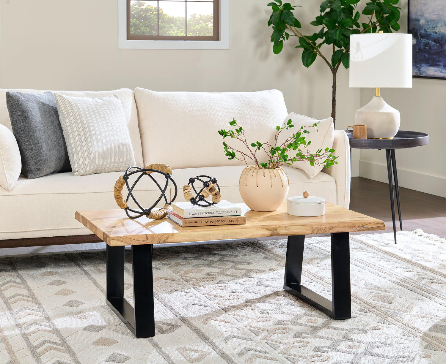 Impress your guests and give your home a modern makeover with this Agra coffee table. A study in simplicity, this wooden table shows that some of the best looks are au naturel. The beauty of the bare acacia wood is on full display, with ribbons of woodgrain, live edges and plenty of rugged imperfections that tell each table's history. Completing the dashing style are the two trapezoid-shaped legs. In their black finish, they create a stunning, two-tone look to the entire piece.