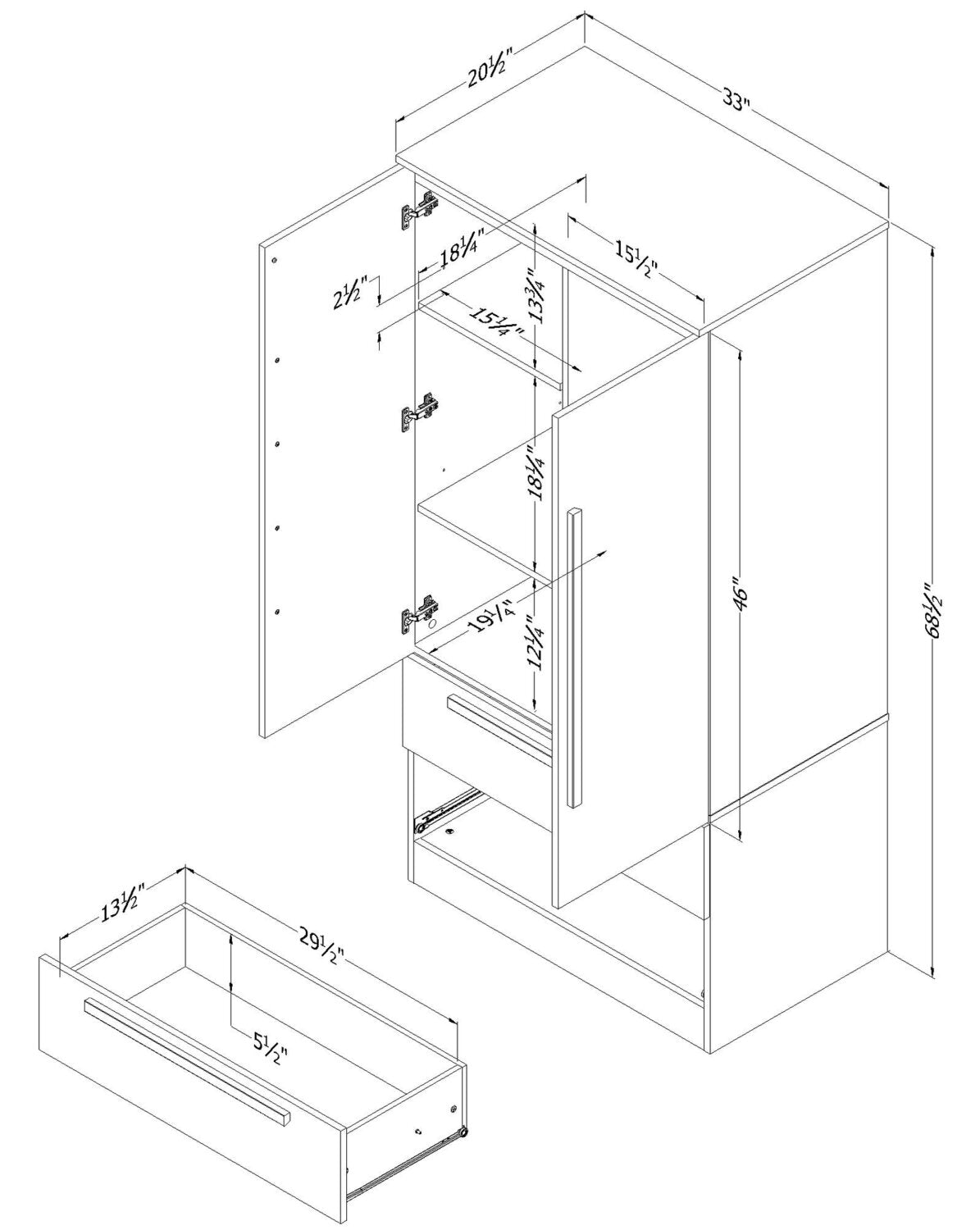 Width: 33" (83.8 cm) Height: 68.5" (174.0 cm) Depth: 20.5" (52.1 cm)