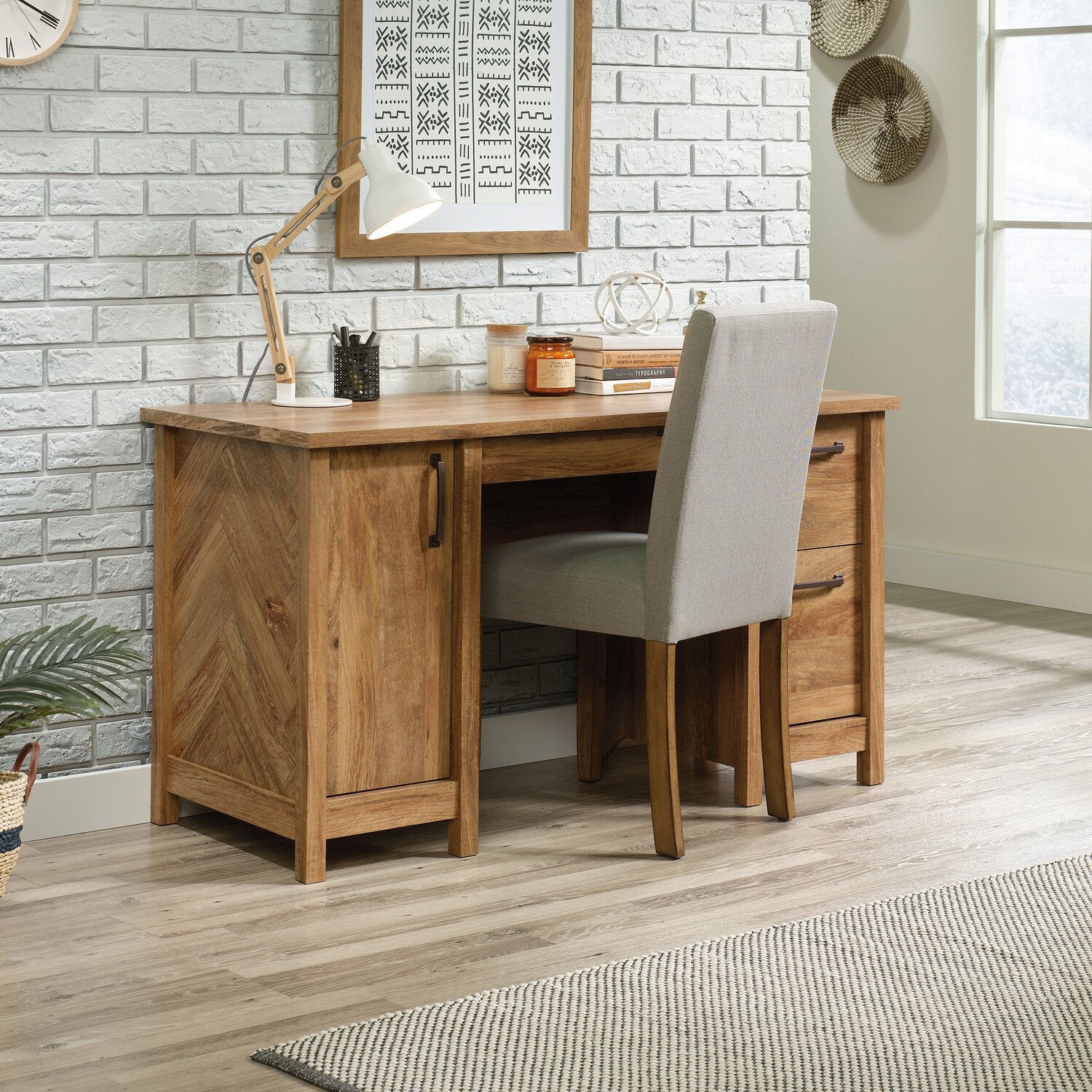 Give your office or workspace the upgrade it needs with the charming good looks of this Alfie executive desk. This unit offers a spacious top surface that provides all the room you need for your must-have desk essentials like your laptop, a stack of notepads, your collection of pens and a hot cup of coffee. It features three drawers that open and close on smooth metal runners, and the lower drawer holds letter-sized hanging files to help keep your documents organized. Behind the cabinet door is even more storage that includes an adjustable shelf and room to hold a vertical CPU tower. Finished on all sides with a herringbone pattern for an extra touch of detail, this stunning computer desk is just what you need.