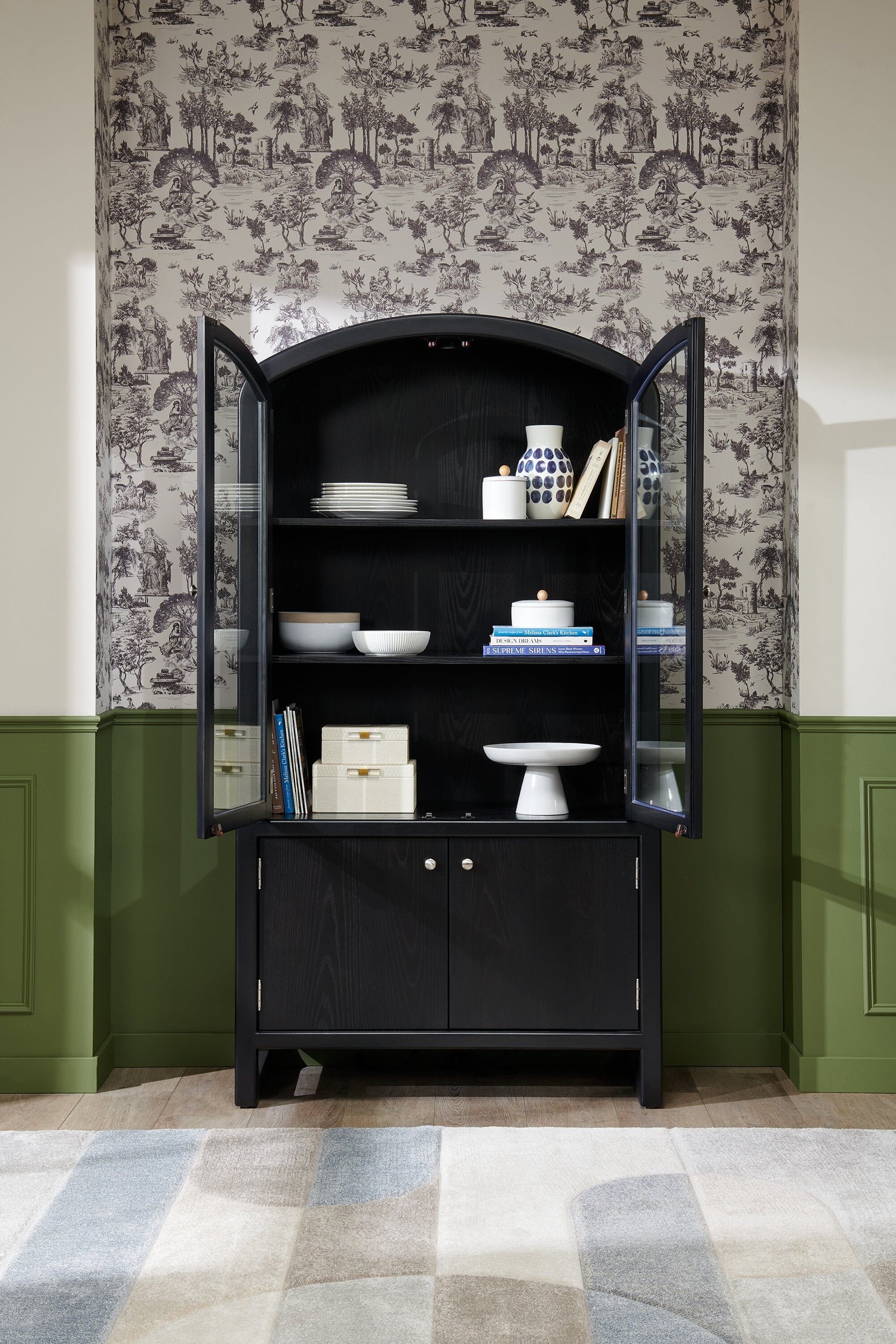 | Storage Options | Display dinnerware and cherished dishes in the windowpane cabinet and store additional platters and utensils in the lower cabinet. |