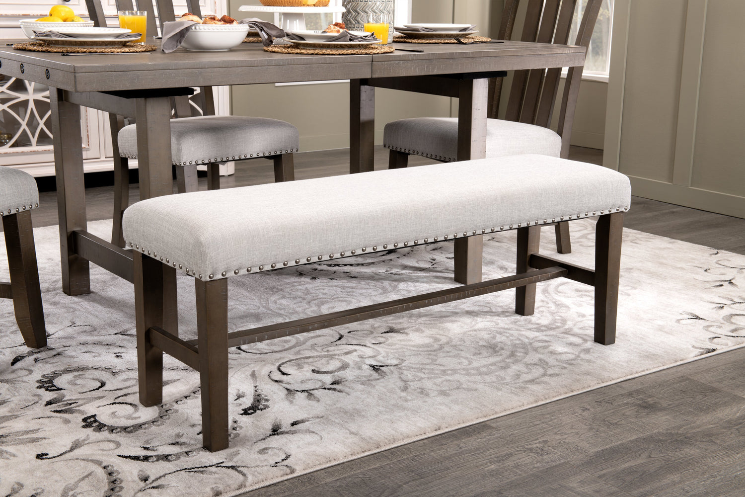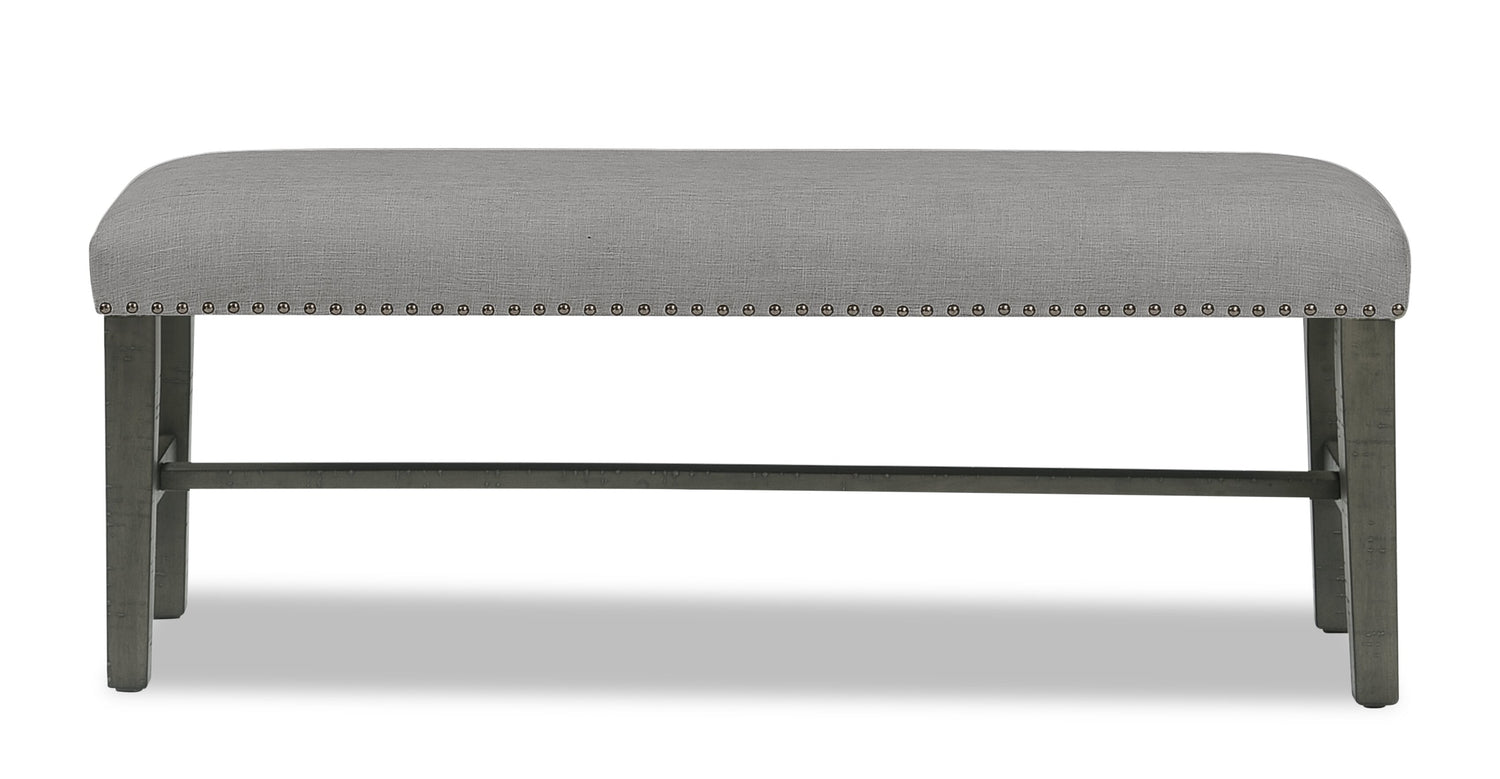 Take a seat and enjoy this Alto dining bench's fresh take on rustic charm. Acacia wood veneers cover this piece with a distressed, grey-brown finish to suit different dining room decor styles. Plus, thanks to the variety of wood grain patterns used, each piece is unique to your home. Linen-look fabric envelops the thick, high-density foam seat and is secured with antiqued nailheads. With a classic trestle base to link the four legs together for support, this piece doesn't lack for style or substance.