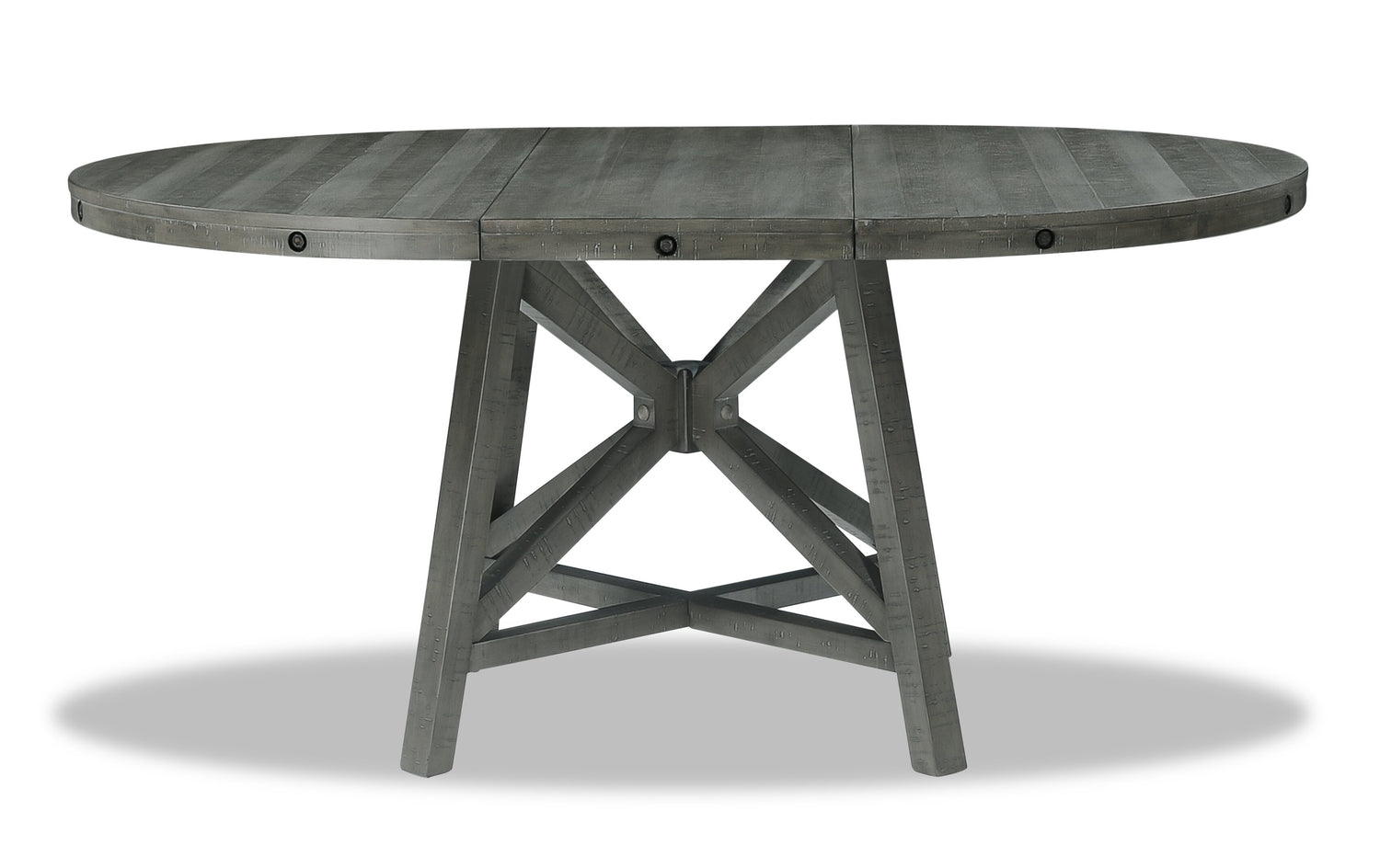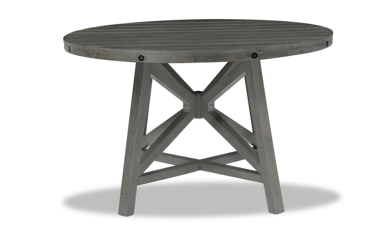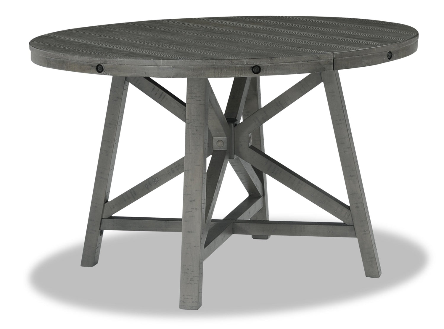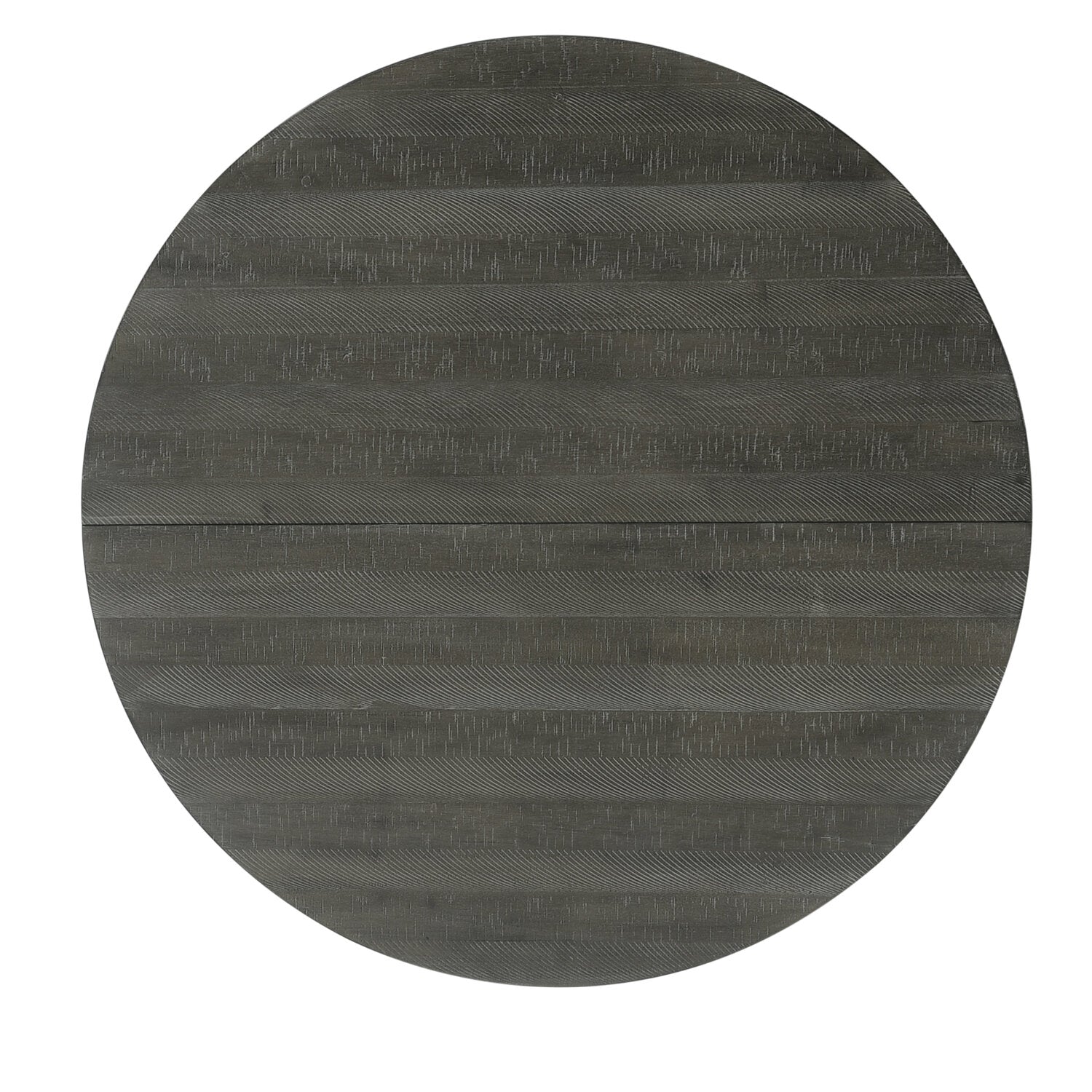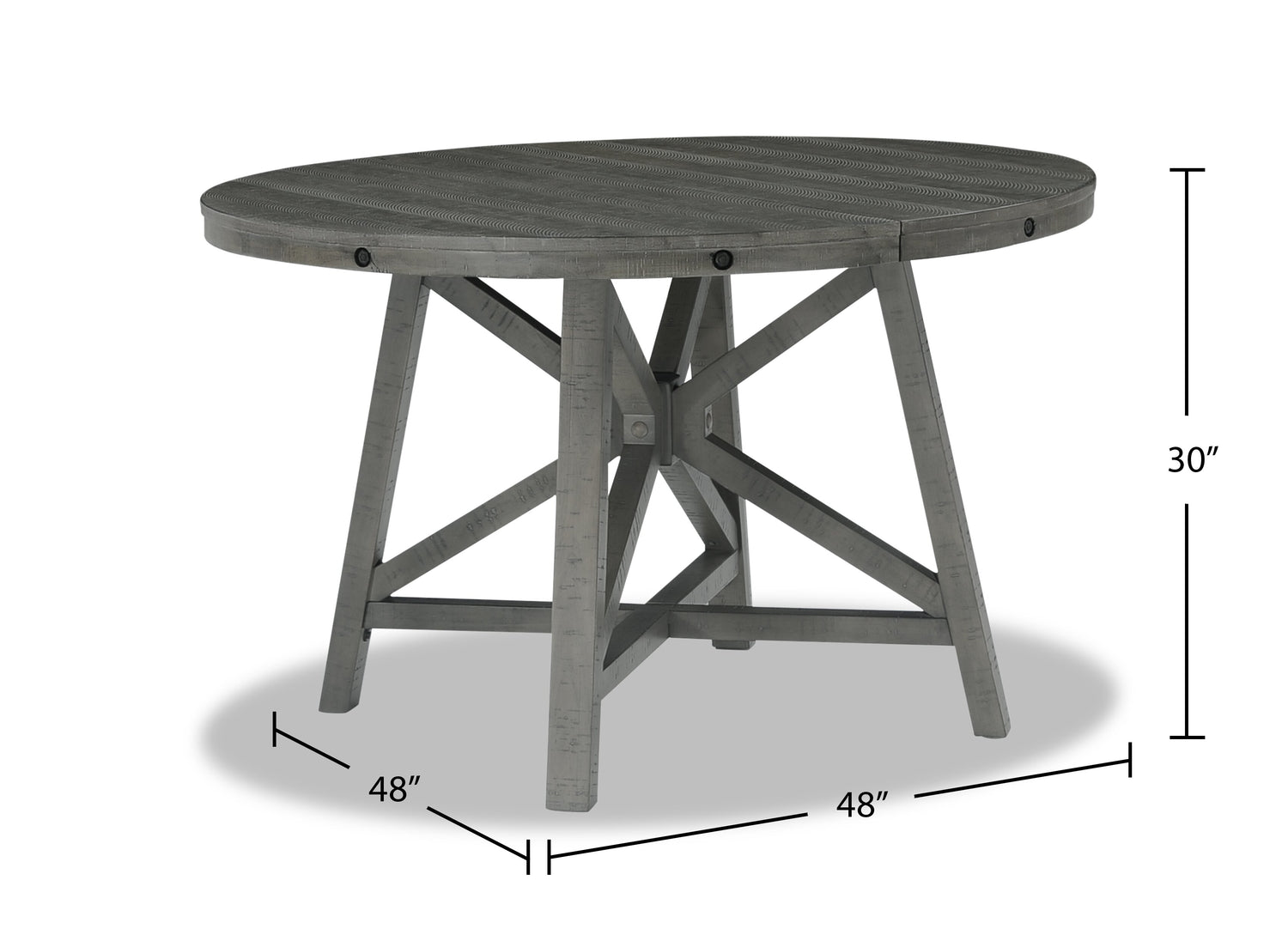 Take a seat and enjoy this Alto round dining table's fresh take on rustic charm. Acacia wood veneers cover this piece with a distressed, grey-brown finish to suit different dining room decor styles. Plus, thanks to the variety of wood grain patterns used, each piece is unique to your home. A pedestal base secures the legs together to support you through large family meals. Speaking of large, use the included table leaf to ensure you can seat up to eight people easily. With dark metal nuts bolted into the table's edge, this piece doesn't lack for style or substance.