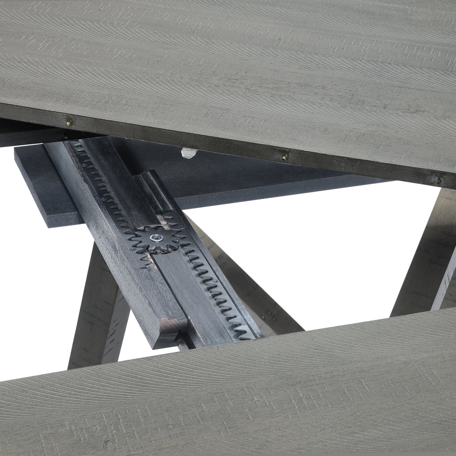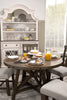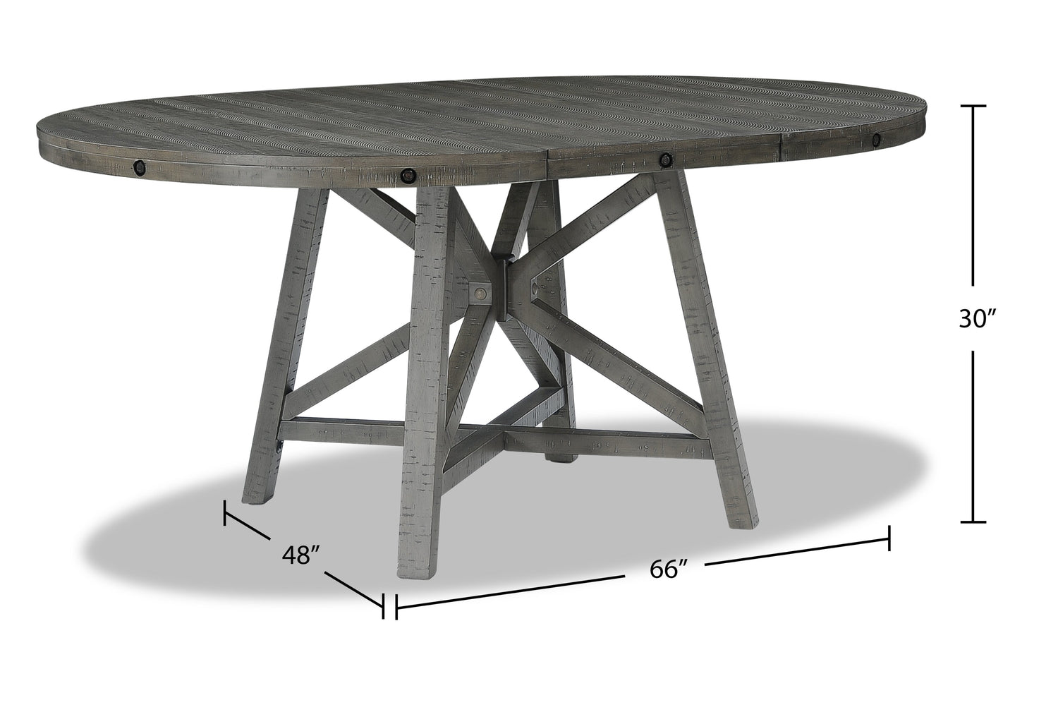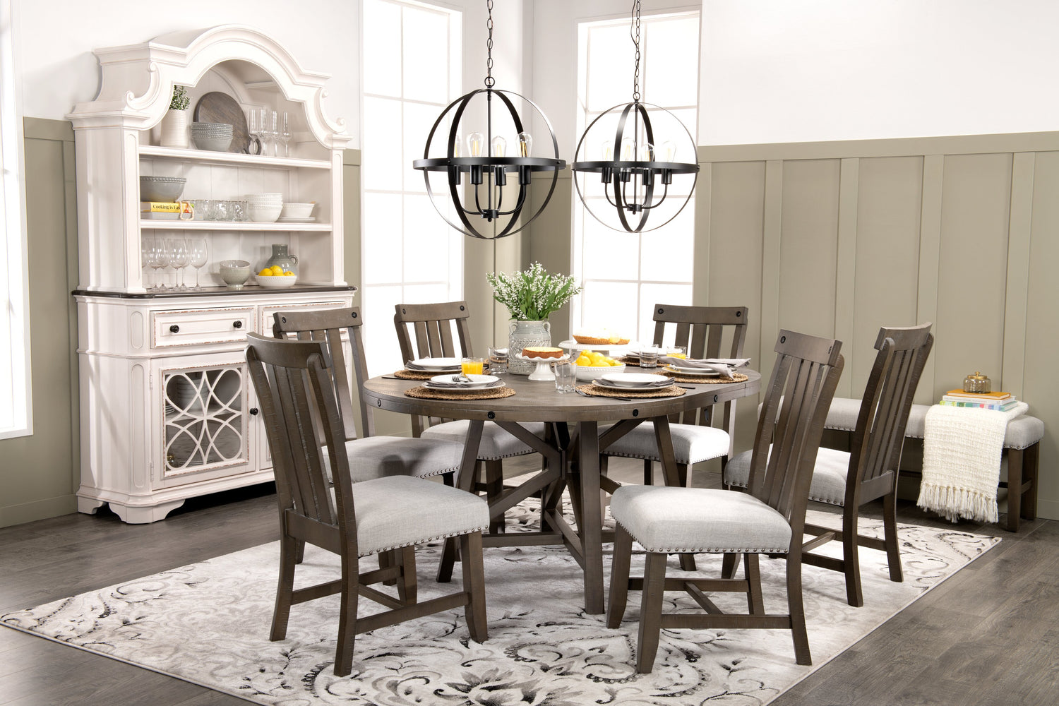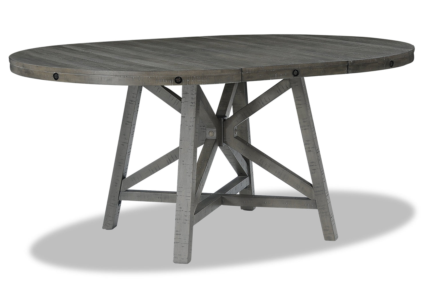 Take a seat and enjoy this Alto round dining table's fresh take on rustic charm. Acacia wood veneers cover this piece with a distressed, grey-brown finish to suit different dining room decor styles. Plus, thanks to the variety of wood grain patterns used, each piece is unique to your home. A pedestal base secures the legs together to support you through large family meals. Speaking of large, use the included table leaf to ensure you can seat up to eight people easily. With dark metal nuts bolted into the table's edge, this piece doesn't lack for style or substance.
