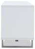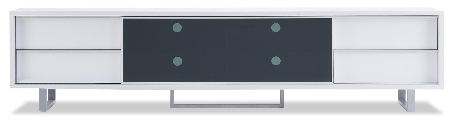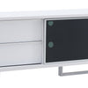 Enhance your living space with the modern, minimalist style of this Amelia TV stand. Its clean, low-profile design can hold a TV up to 100 inches, with plenty of space for a soundbar and speakers. A bright white finish is complemented by a black glass sliding door, creating a bold contrast and the ability to change up the look of the piece. Highlight the interior shelves with accent pieces or keep them concealed when storing media consoles and other devices. Plus, this TV stand comes with four drawers to tuck away unwanted clutter. Impress your guests with the sleek, streamlined look of the Amelia.
