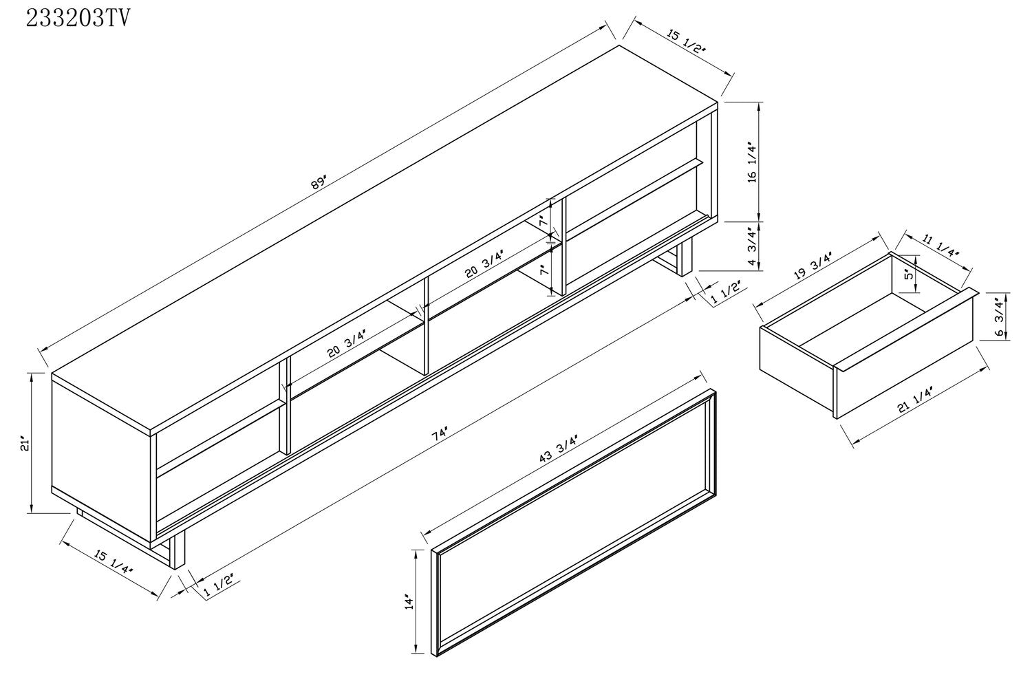 Width: 89" (226.1 cm) Height: 21" (53.3 cm) Depth: 15.5" (39.4 cm)