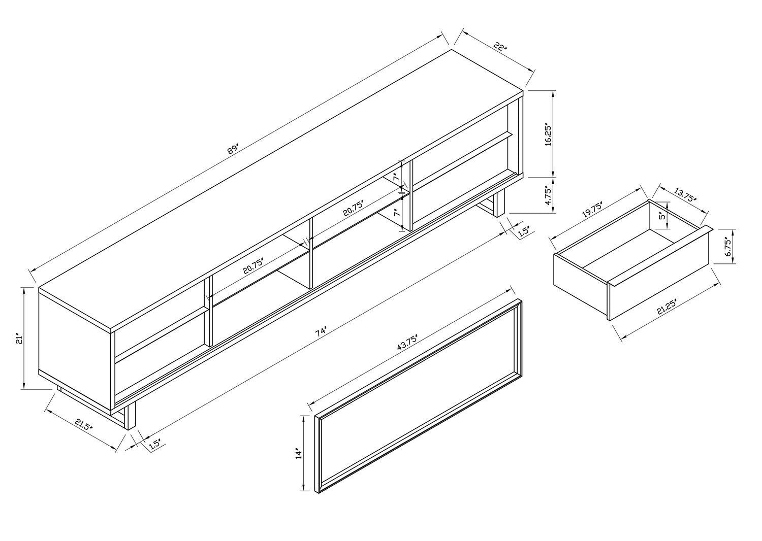 Width: 89" (226.1 cm) Height: 21" (53.3 cm) Depth: 22" (55.9 cm)