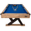 Provide your family and friends with hours of entertainment with the American Legend Kirkwood 84" Billiard Table. This classic game table features a rustic finish, unique k-shaped legs, a rustic, blond cabinet and royal blue cloth, a combination that will liven up any room in any home. Its 36mm thick engineered wood playfield with two-ply lamination prevents warping while the cloth playfield with K66 nose rubber cushions provide true, reliable bank shots and rebounds. The pool table features concealed drop pockets and shims for uneven flooring. The Kirkwood is ready to play on its own with two 57" wood cues, a set of billiard balls, a triangle rack, a table brush and two pieces of chalk.