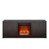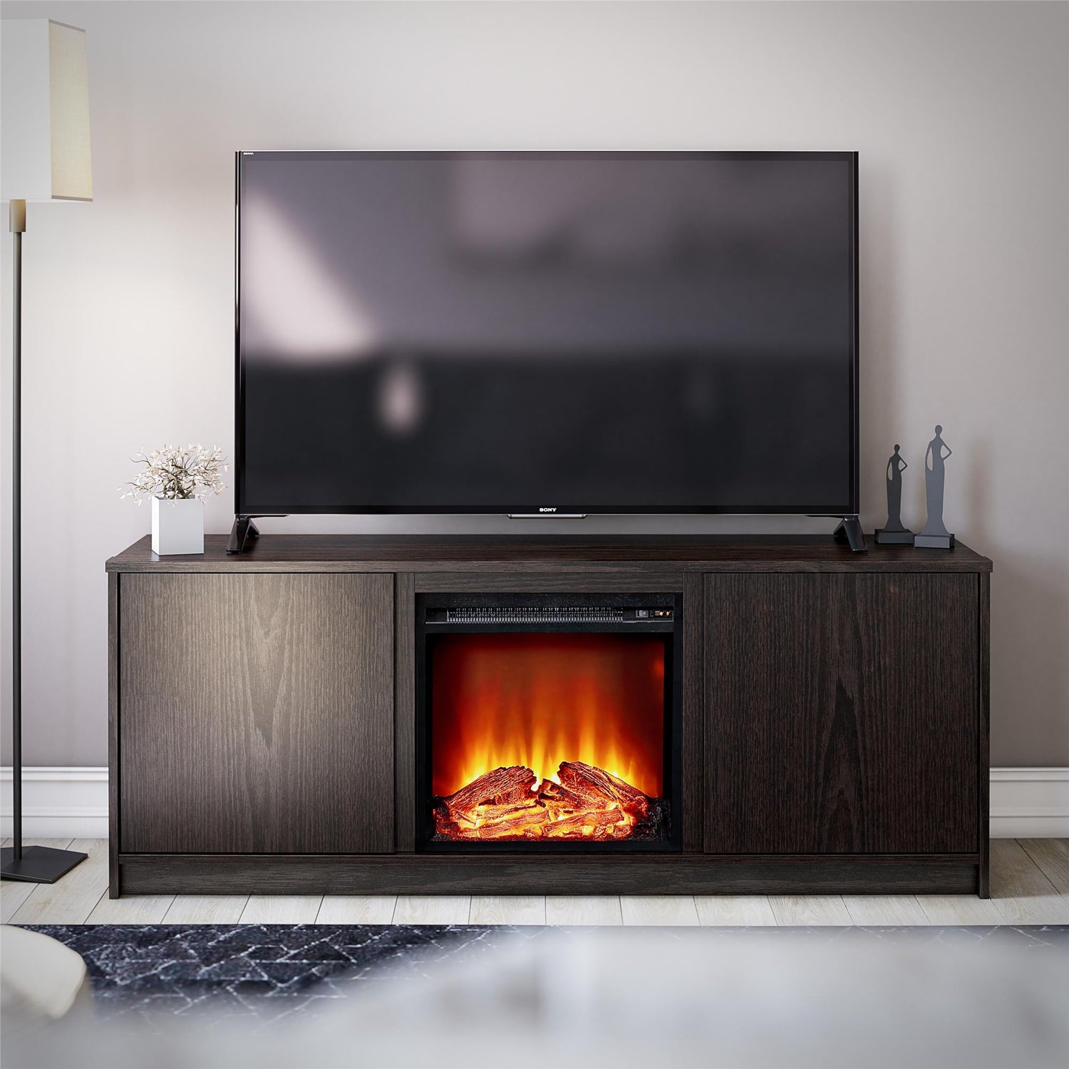 Turn up the dial for warmth and convenience with the Bartow Fireplace TV Stand from Ameriwood Home. This sleek modern style TV Stand with Electric Fireplace is rated to fit most flat screen TVs up to 65" or up to 120 lbs. and offers plenty of spacious storage for your AV components, game systems, and more. Two cabinets flank each side of the fireplace and feature a total of four storage compartments complete with adjustable shelving to fit your needs. Wire pass-throughs in the back of the unit make setting everything up a breeze while keeping cords tangle free. The 18" x 18" Electric Fireplace Insert can heat a room up to 400 sq. ft. and features a realistic flame effect that can be used with or without heat so you can keep the ambiance even in the warm summer months. This TV Console is the ideal addition to your living room, teen's room, Airbnb, dorm room or apartment. The electric insert plugs into a standard 120V outlet and the LED light source boasts up to 50,000 hours of life so you can enjoy the flame effect for years to come. The Bartow TV Stand with Electric Fireplace ships flat in one box and requires minimal assembly. Assembled dimensions: 59.61" W x 15.79" D x 22.80" H.