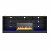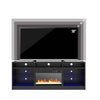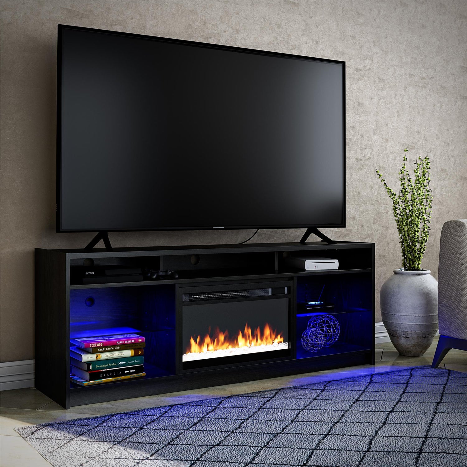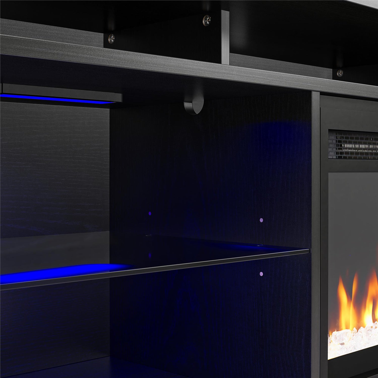 Light up the night and cozy up to the Luna TV Stand with Fireplace by Ameriwood Home. This modern fireplace entertainment center is comprised of ultra-durable engineered wood, with two gorgeous adjustable glass shelves, and is rated to hold most flat screen TVs up to 65" or up to 120 lbs. LED light strips illuminate the inside of the console to create the perfect mood lighting. Store components or decor on any of the six shelves, and easily connect them to a power source through conveniently located wire pass-throughs. The TV console with fireplace heater brings warmth and ambiance to your living room or bedroom with a 23" modern electric fireplace insert featuring multi-colour flames and a lustrous white crystal ember bed. Ready to warm a 400 square foot room with the touch of a button, you can relax knowing that timers will take care of the rest. If you want to simply enjoy the look of the flames without the heat, use the remote with included AAA batteries to switch off the fireplace heater option and pick your flame brightness and colour. Putting it together is a snap thanks to the clearly marked parts, and our support team is always ready to help. The tempered glass front remains cool to the touch, ensuring safety for children and pets. Additionally, replacement inserts keep your furniture looking stylish and elegant for years to come. The TV stand with fireplace ships flat in one box and requires assembly by two adults upon opening. Assembled dimensions: 60.87 in. W x 15.67 in. D x 23.27 in. H.
