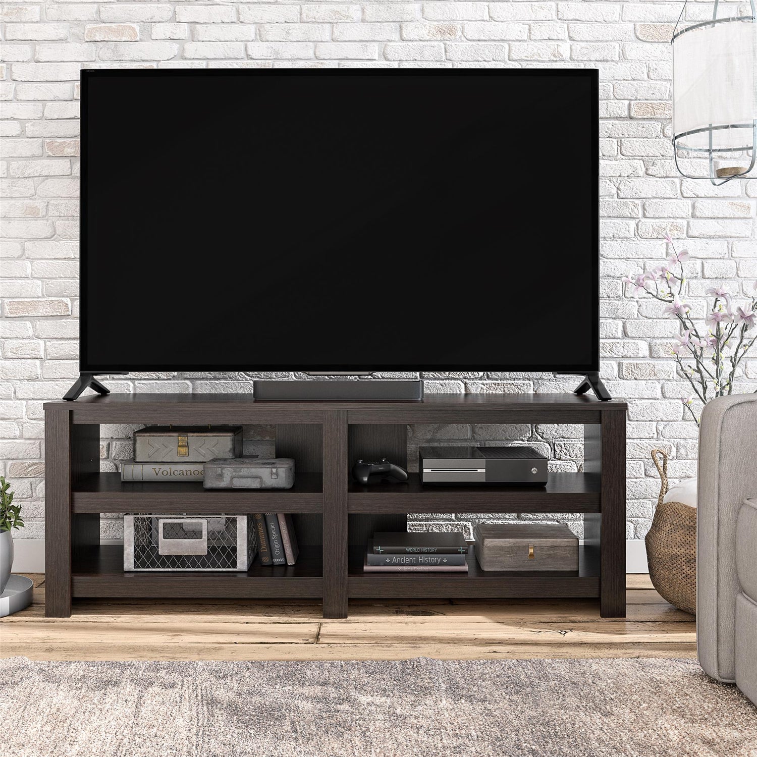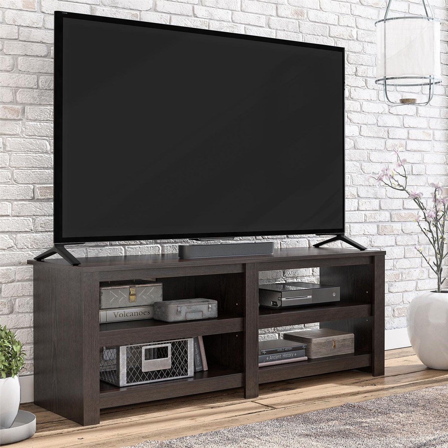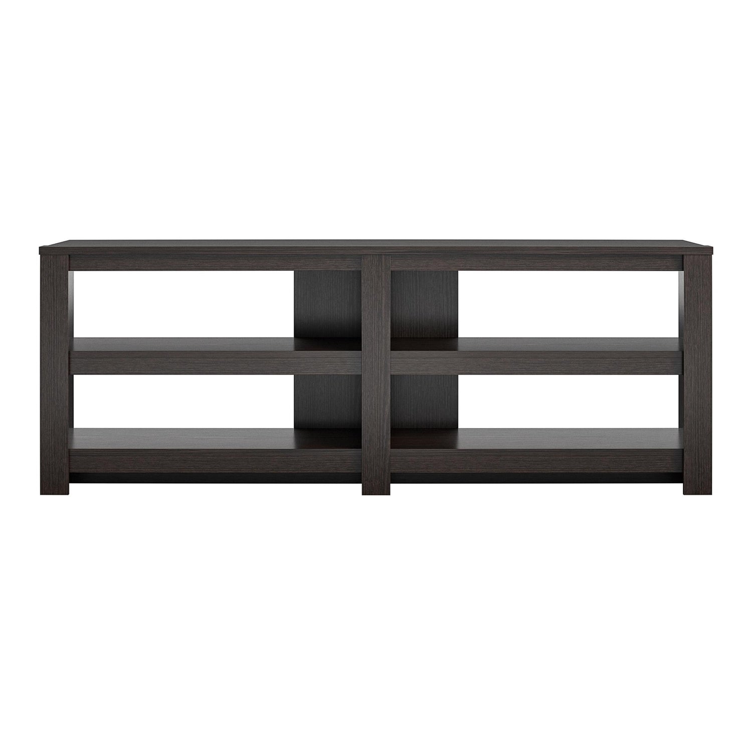 Get a classic TV Stand for your flat screen TV with this TV Stand for TVs up to 60" wide. This Stand can accommodate TVs up to 60" wide or 95 lbs. The classic espresso finish on the laminated MDF and particleboard gives the Stand an updated feel that pairs perfectly with your existing decor. The 4 open shelves can hold your DVD player, cable box, and gaming system. The open concept design allows proper air circulation for your components and makes plugging devices in simple. The top 2 shelves are adjustable to fit various sized components. The Stand ships flat to your door and requires assembly upon opening. Two adults are recommended to assemble. Once assembled, the TV Stand measures to be 22"H x 59.6"W x 18.4"D.