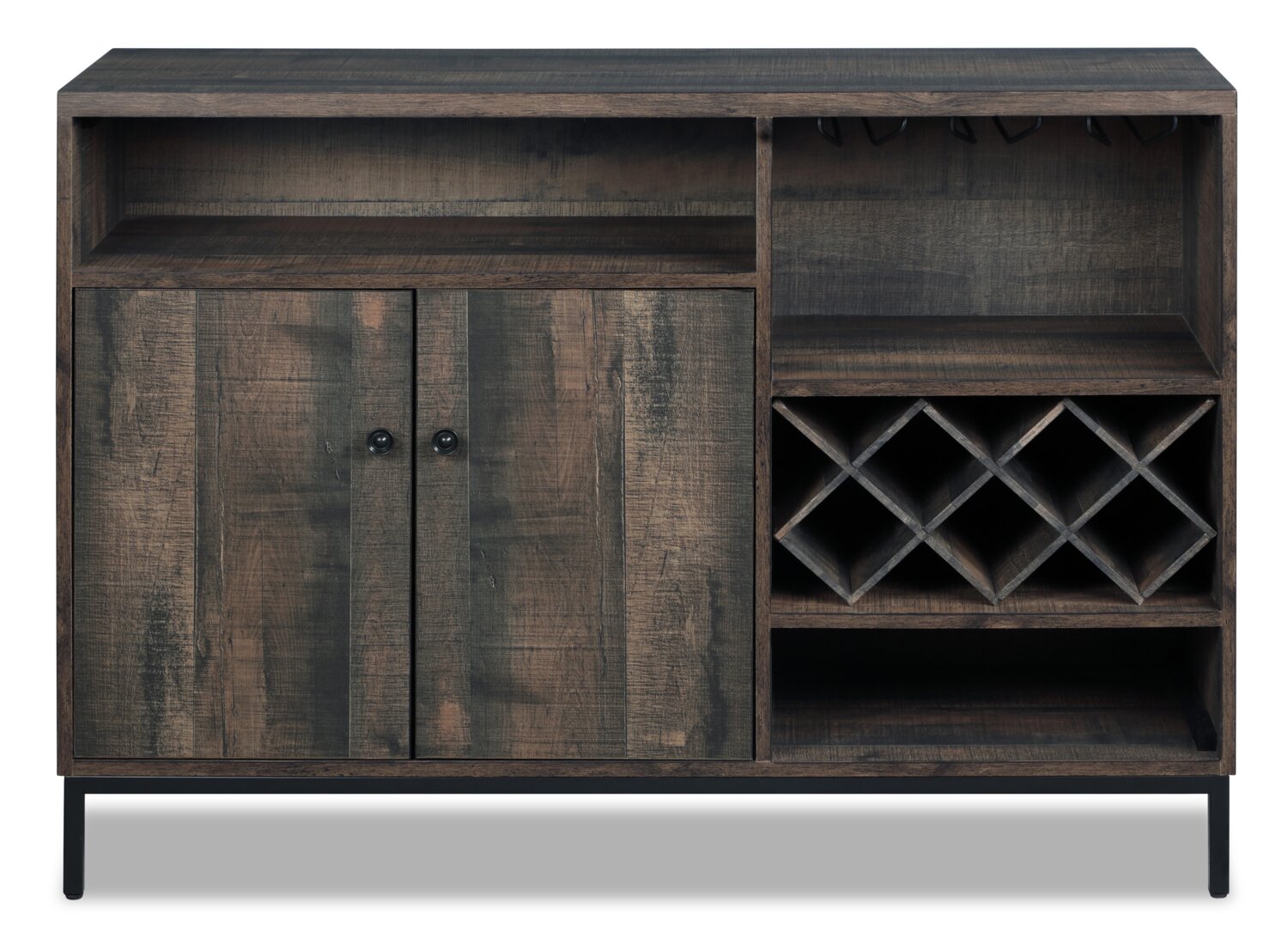 Host your family with the help of this rustic-modern Amos server. Wood grain-patterned paper laminate covers the entire piece, creating an easy-to-maintain outdoorsy look. Protect your favourite dinnerware set or serving dishes by placing them inside the two-door cabinet, while more commonly used plates or bowls can rest inside the shelf above the cupboard. If you love having your preferred drinks within easy reach, simply place five of your choice bottles in the wine rack while wine glasses hang from the storage bracket. Enjoy entertaining your friends and family thanks to this Amos server.
