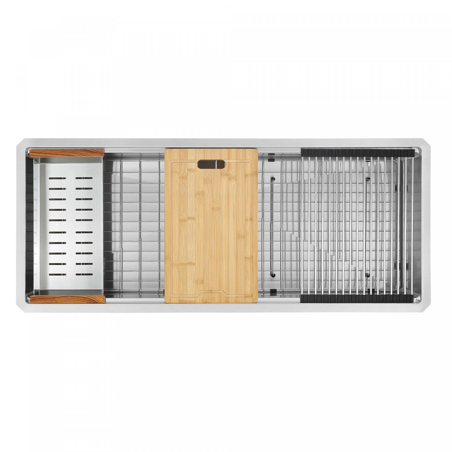 Handcrafted in 18-gauge stainless steel, this undermount sink features a unique ledge that allows the custom accessories to slide across the sink, so you can effortlessly go from meal prep to clean-up. The 10” deep bowl with rear drain maximizes your valuable kitchen space, and the custom grid will keep your sink looking its best. Quality and design are expertly paired in this workstation.