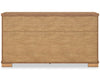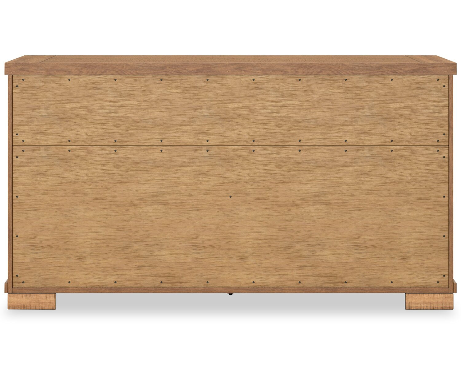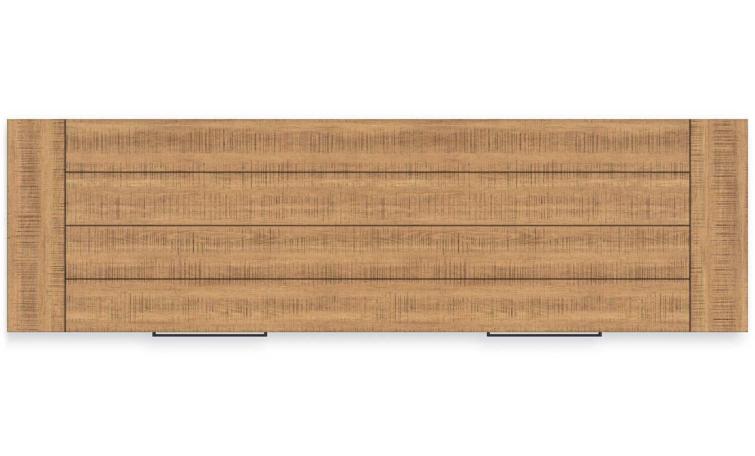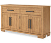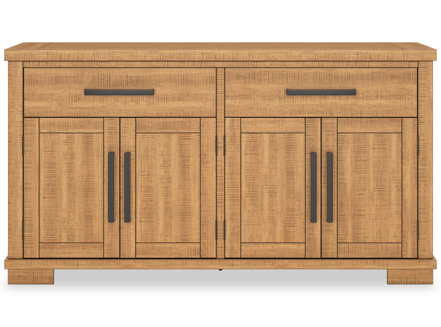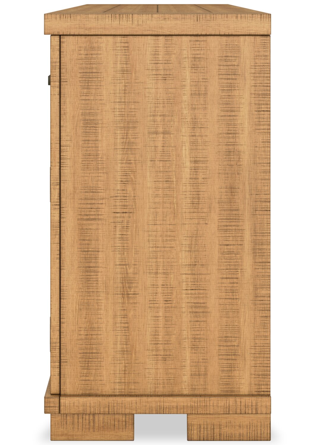 | Accent Details | Black metal door pulls accent the light brown pine finish, emphasizing the rustic design of this piece. |