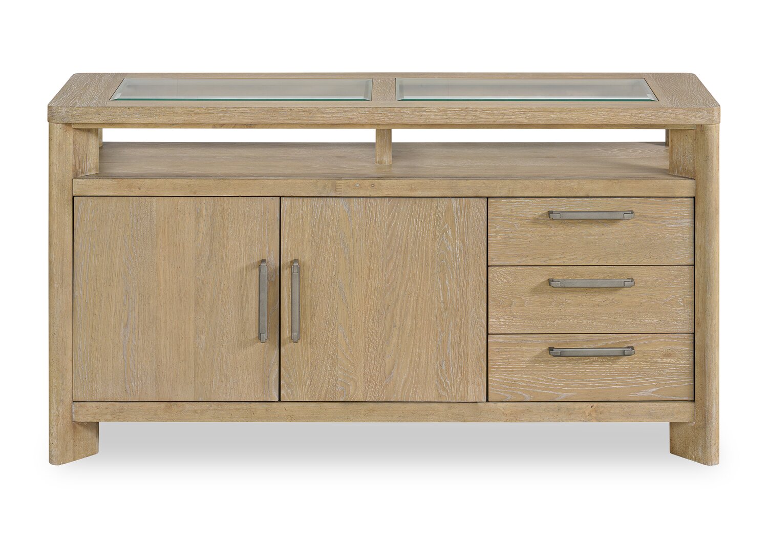 Keep dishware, glasses and after-dinner drinks easily on hand with this Aspen server. Its neutral tone will blend in seamlessly with your already-existing decor, while the champagne-coloured hardware adds a touch of sophisticated style. Ample storage is provided by three drawers, two cabinets, two shelves, two removable wine racks and a stemware rack for a stress-free dining experience. Setting the table has never been easier, thanks to the Aspen server. Dine, relax and enjoy mealtimes by completing your dining room set with the rest of the Aspen collection (sold separately).