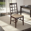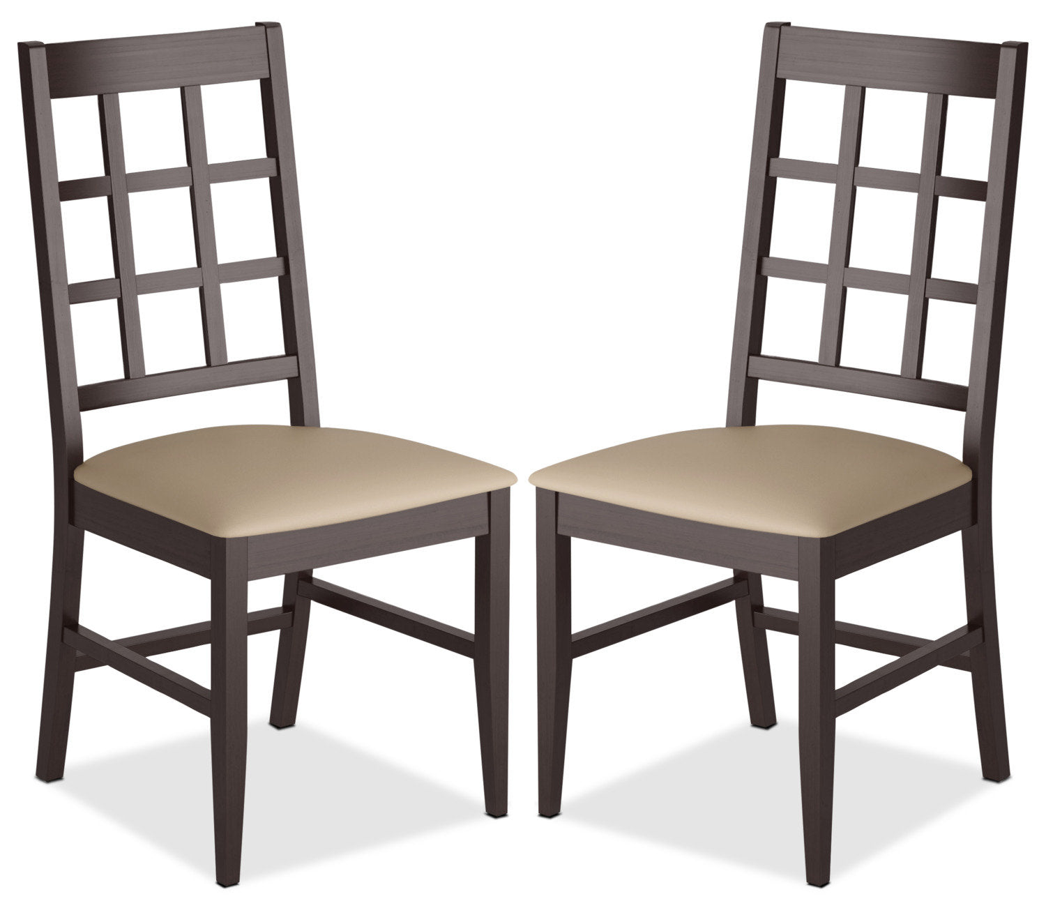 Sit down to every meal in style with one of these two Atwood dining chairs. With a wooden, grid backrest and a contemporary, grey faux leather seat, this chair will make dinner time a more graceful affair. These matching chairs effortlessly complement most decor schemes thanks to the tasteful cappuccino stain on the sturdy, rubberwood legs. Plus, the foam cushioning inside the chair seat allows you to spend countless hours relaxing with friends and family.