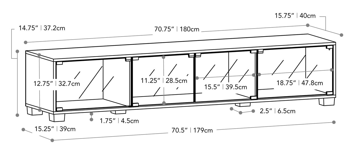 Width: 71" (180.3 cm) Height: 12" (30.5 cm) Depth: 15" (38.1 cm)
