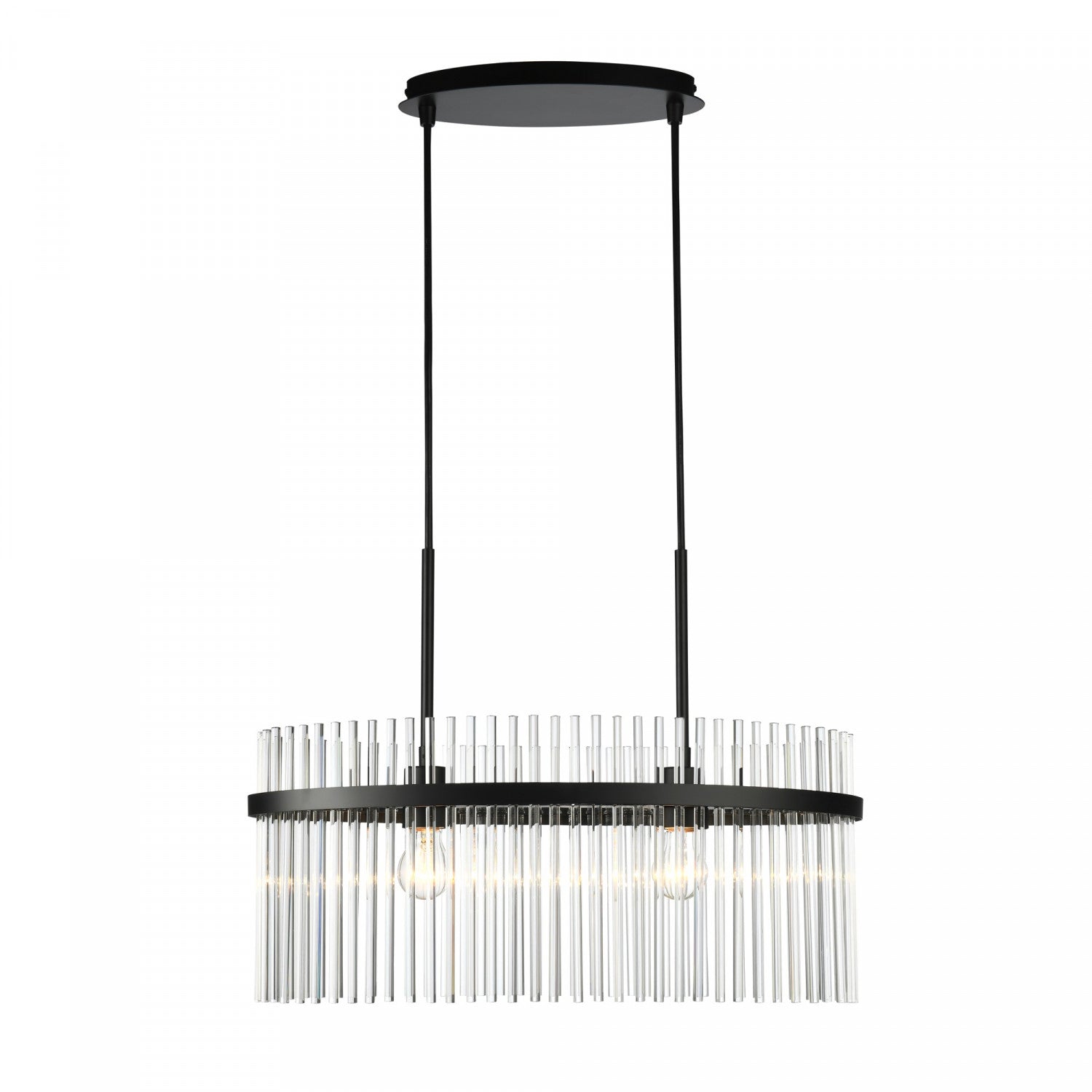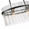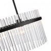 The ava collection oval chandelier enchants with its delicate arrangement of circular glass rods, elegantly suspended on a sleek black frame. Its versatile design harmonizes beautifully with both circular and rectangular tables, adding a touch of refined glamour to any room. (this model is easily height adjustable to meet you preference)