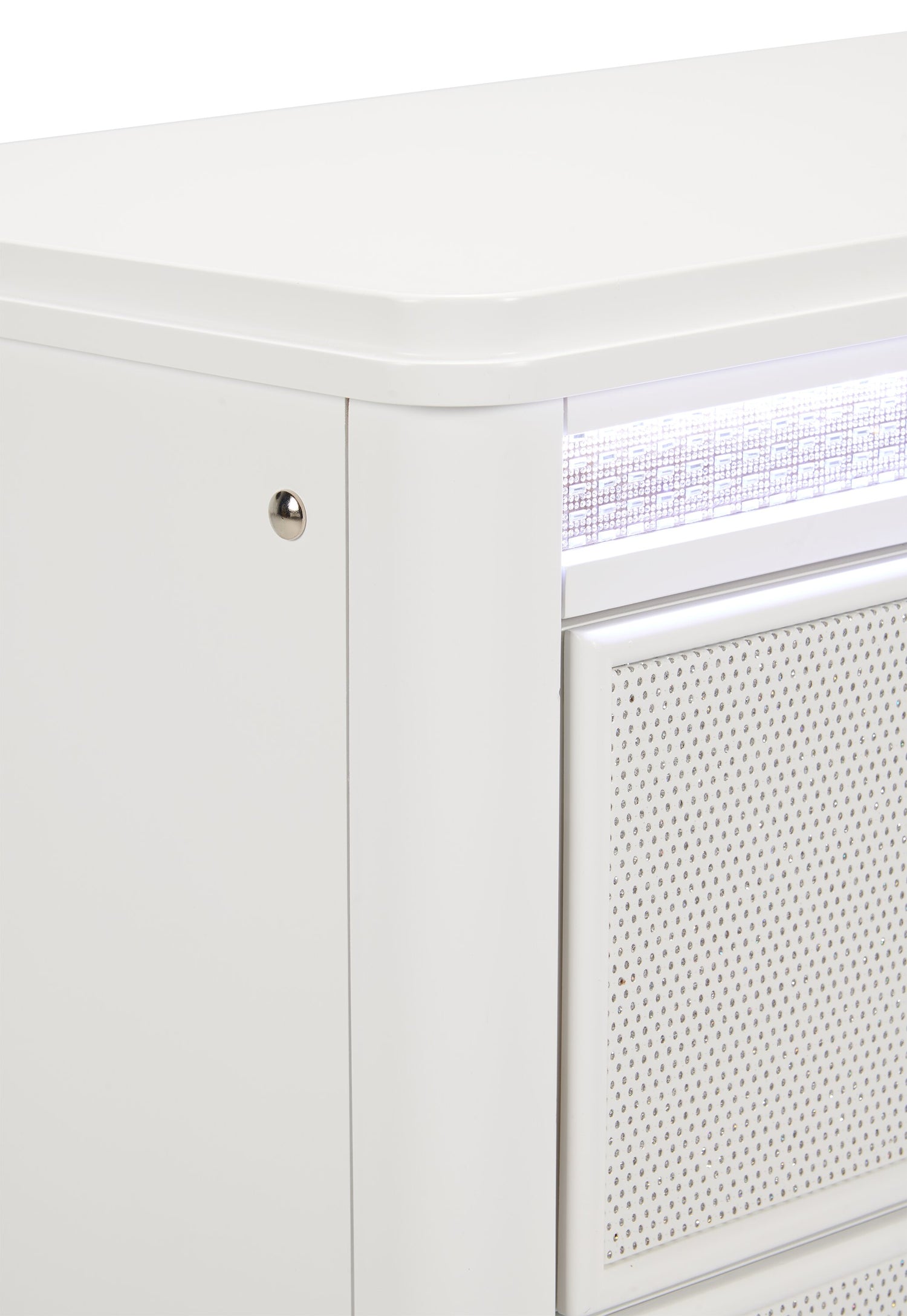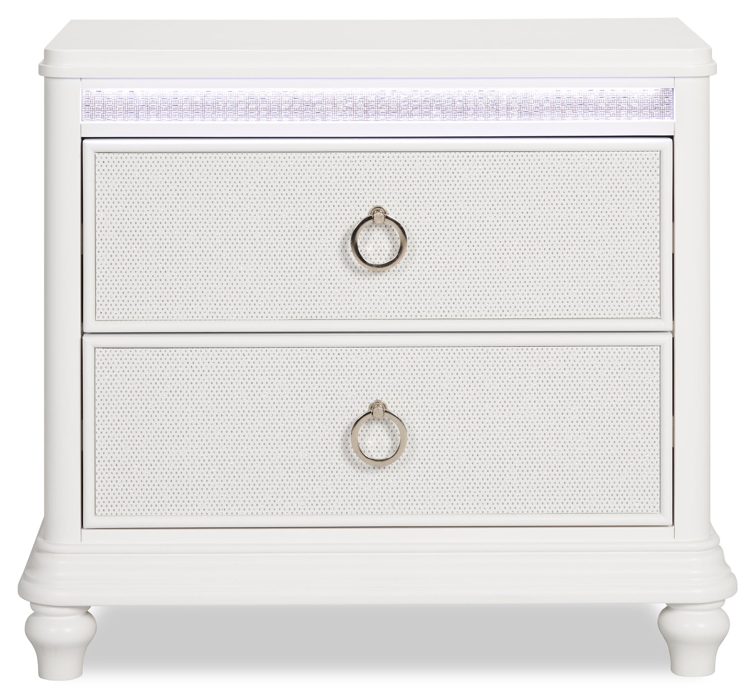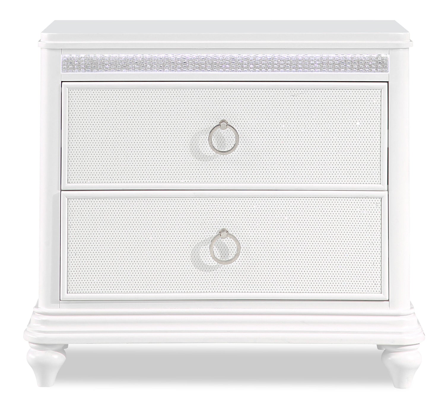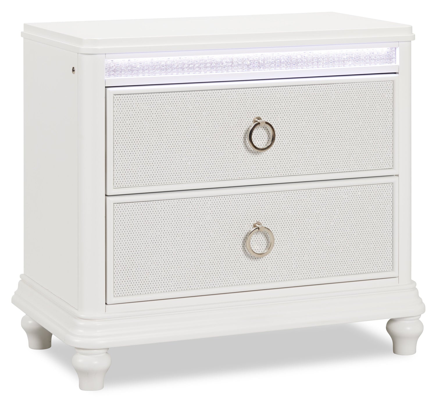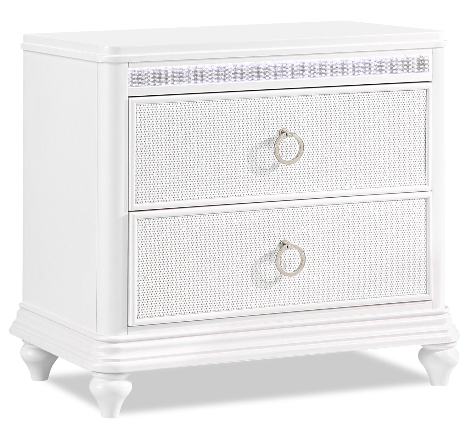 Let glitz and glamour take centre stage in your space with this Ava nightstand. Made from wood and a veneer finish, this piece is as durable as it is ravishing. The white hue provides a neutral backdrop for the radiant crystal-like accents that adorn the drawers, while the ambient LED lighting seen across the top edge dazzles and brightens. You’ll enjoy plenty of storage for your bedroom essentials thanks to the two roomy drawers. Show off your fashionable tastes with the Ava.