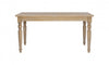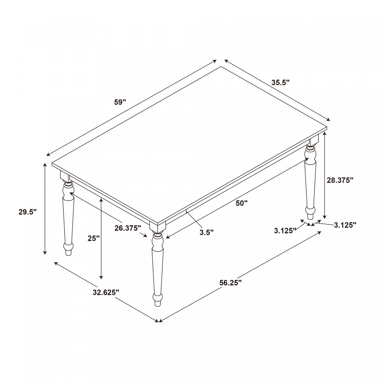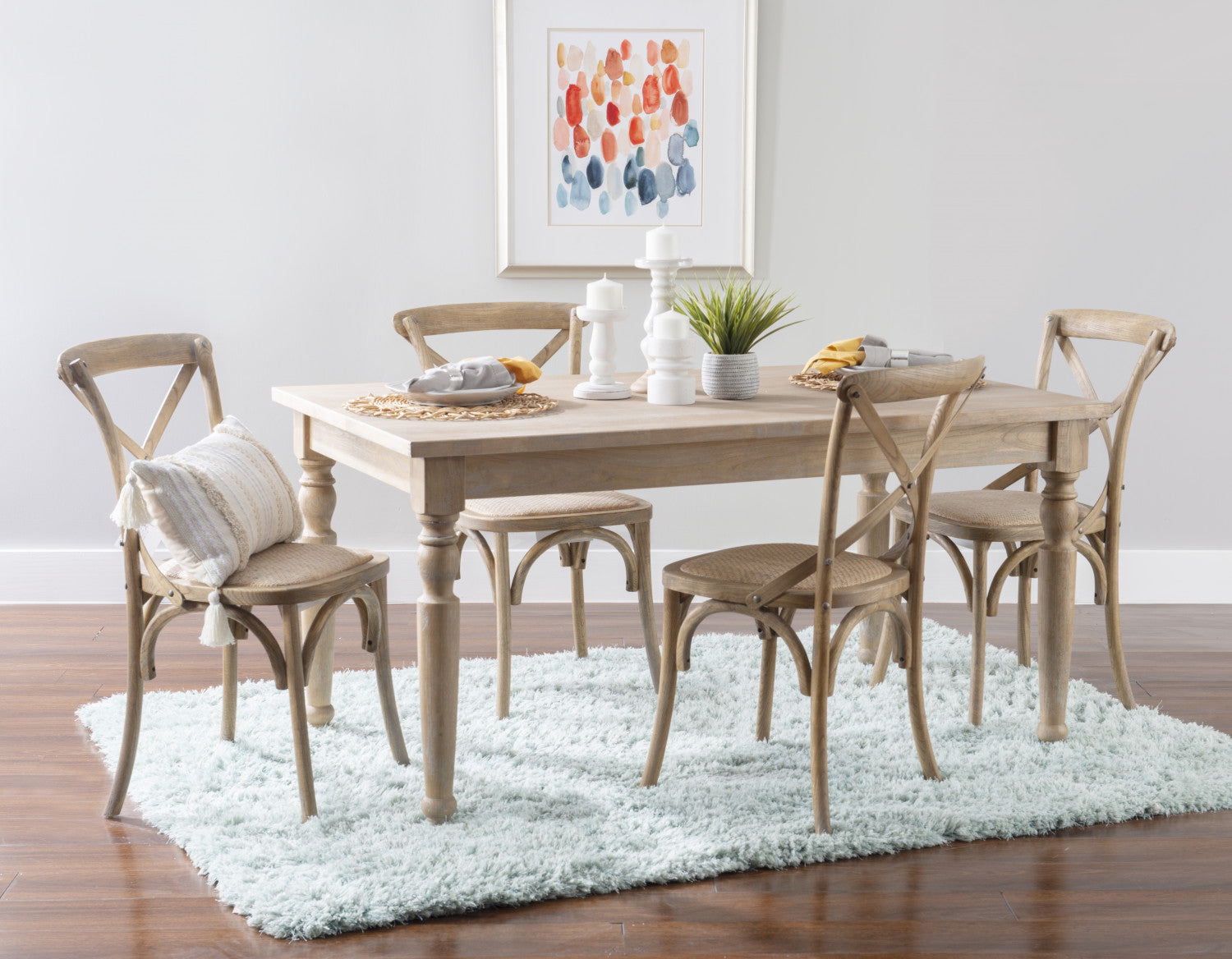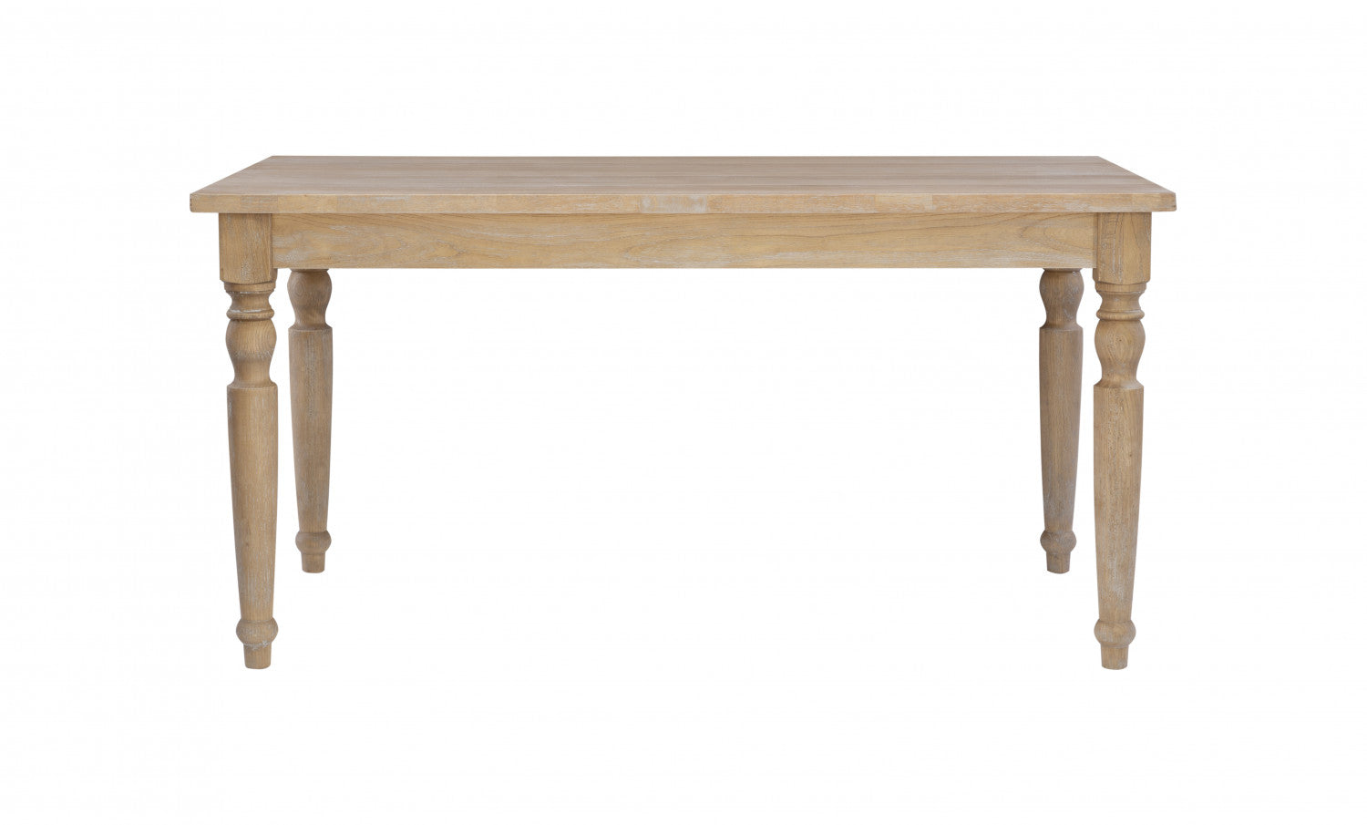 This table has a french inspired design and style. The table features a spacious tabletop that easily seats four. Decorative turned legs add interest to the piece. Finished in a light natural brown, the piece will complement a range of decor schemes.