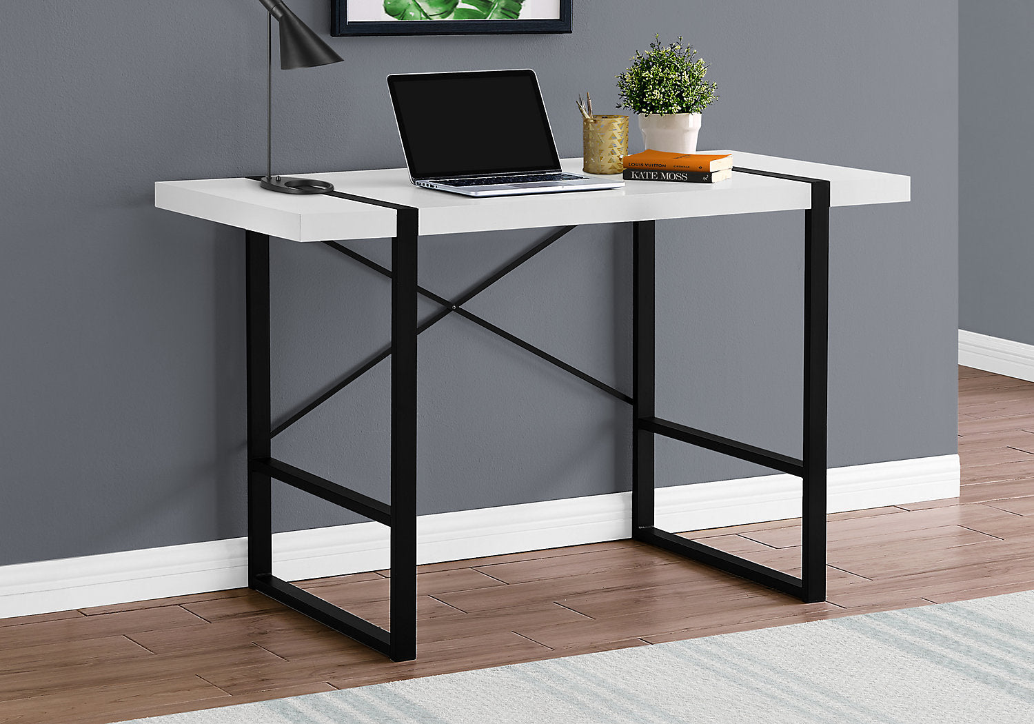 Bold and stylish with an industrial-inspired design, this versatile computer desk makes a grand impression. The black metal tube legs wrap around the thick tabletop to give an unmistakable, rugged presence. Contrast this edgy look with a sleek, white wood-look finish and this piece can easily fit into any urban or rustic style decor. Just the right size for small spaces, this desk can hold a laptop and other office essentials within easy reach.