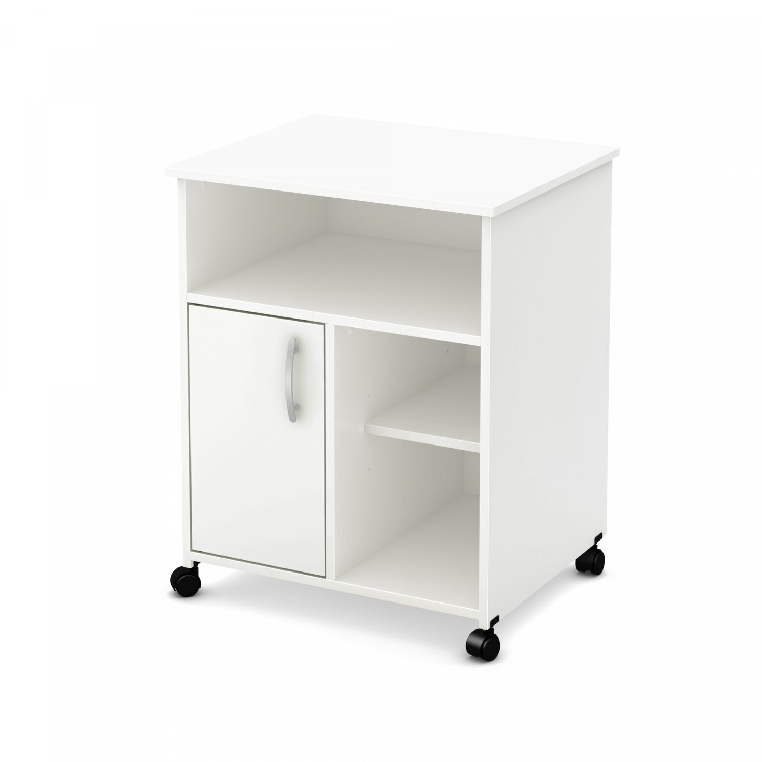 Complements your desk. Does your printer take up so much space on your desk that you find it hard to work? Get this charming little cabinet on wheels, and free up more of your work surface in minutes. The top surface of this piece is just the right size for a printer, and you get multiple storage spaces for your materials. The three open storage spaces are great for keeping paper, card stock, pens, notebooks, and other tools within easy reach. The compartment below has an adjustable shelf that divides it into two spaces. You can use it to store printer ink, extra paper, and a few books. This cabinet is definitely the best companion piece to a computer desk! A trendy little piece that’s easy to move the 4 wheels on this little piece make it very easy to move around the room. You can shift it from one end of your office to the other, depending on where you’d like to have it at any given time! The fairly simple contemporary style, with clean lines and metal handles that set it apart, will also look attractive in any decor for years to come.