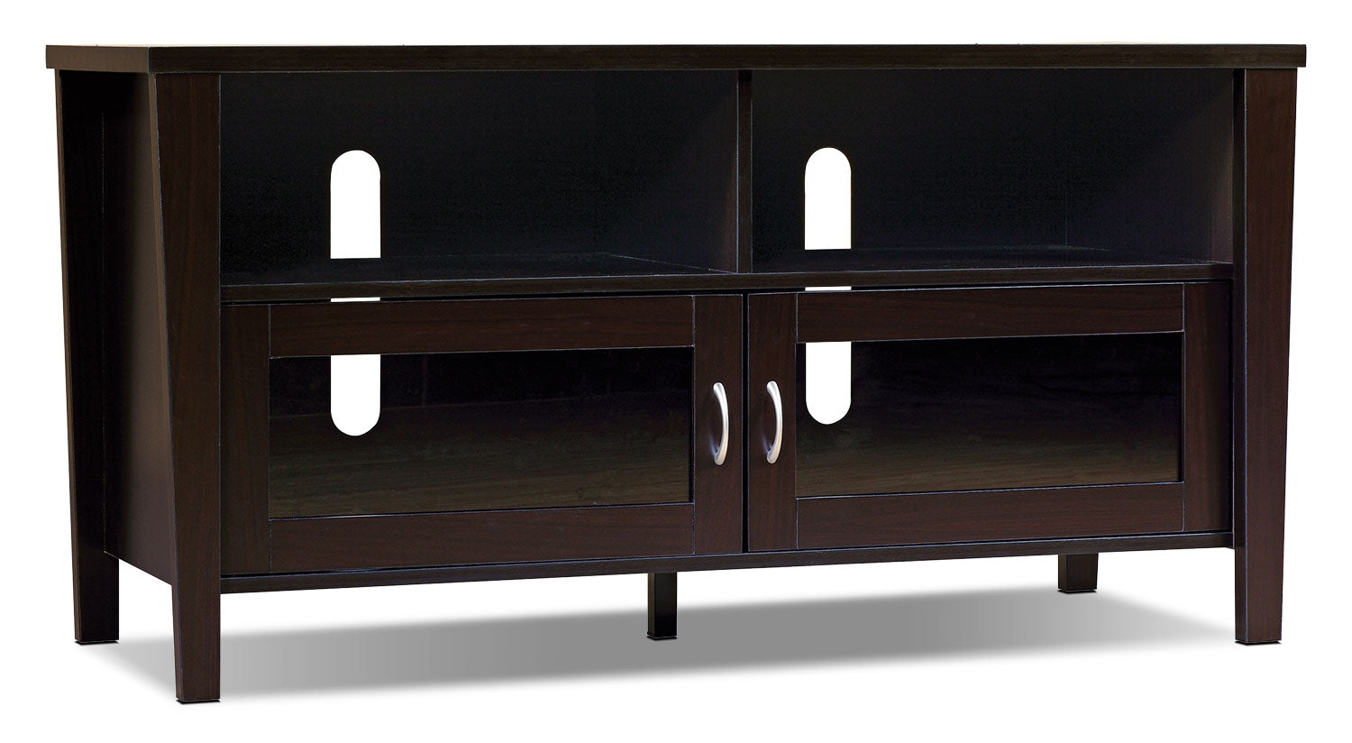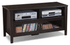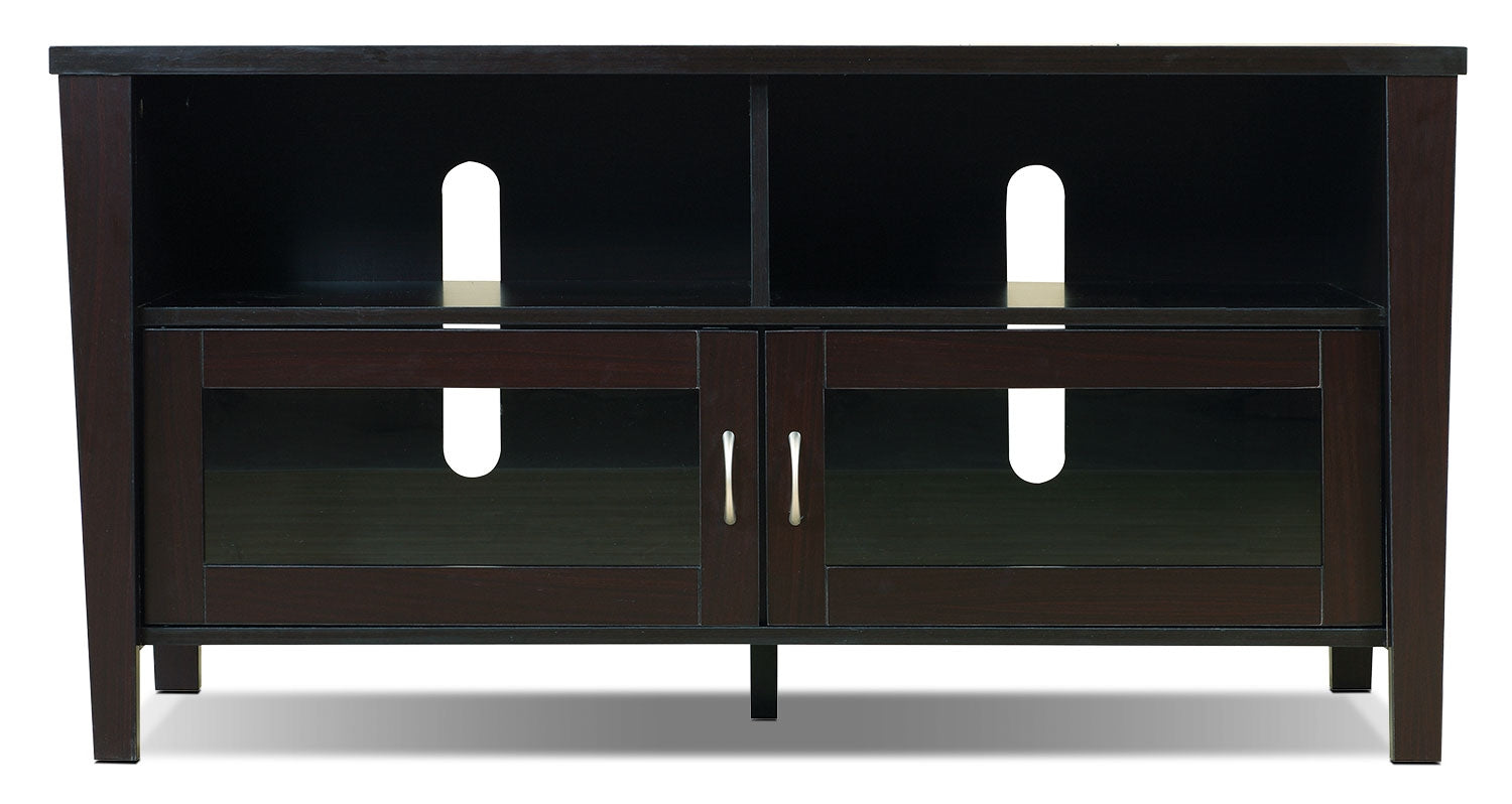 You don't need to sacrifice style for function with this Bailey 47-inch TV stand. Not only does the dark, coffee bean finish create a feeling of warmth with modern style, but the stand also contains storage to make it functional for your family. Open shelves provide a place for your cable box, Blu-ray player and even your router, while the framed glass doors let you organize your movie collection. Plus, you'll keep everything looking tidy thanks to the cable management system.