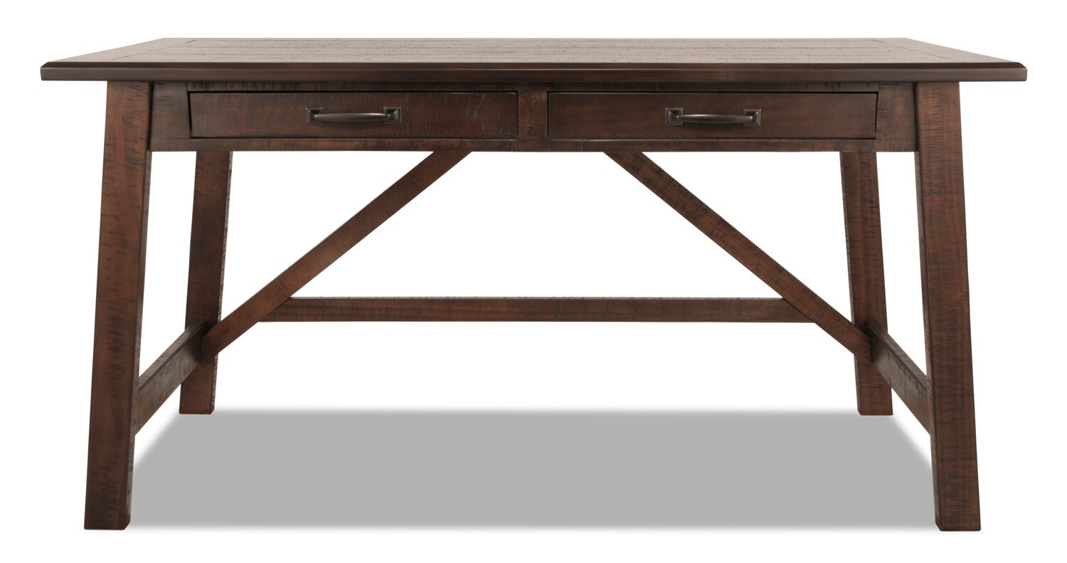 Bring rustic industrial flair to your workday with this Baldridge desk. Canted legs and a cross stretcher brace reflect a stylish, high-quality design that is sure to last you through those long work meetings. Saw marks and antiqued sculptural pulls provide a rich distressed look for a lived-in feel. Plus, two smooth-gliding drawers provide ample storage for all your office supply needs. Introduce some Old World charm into your office space with the Baldridge.