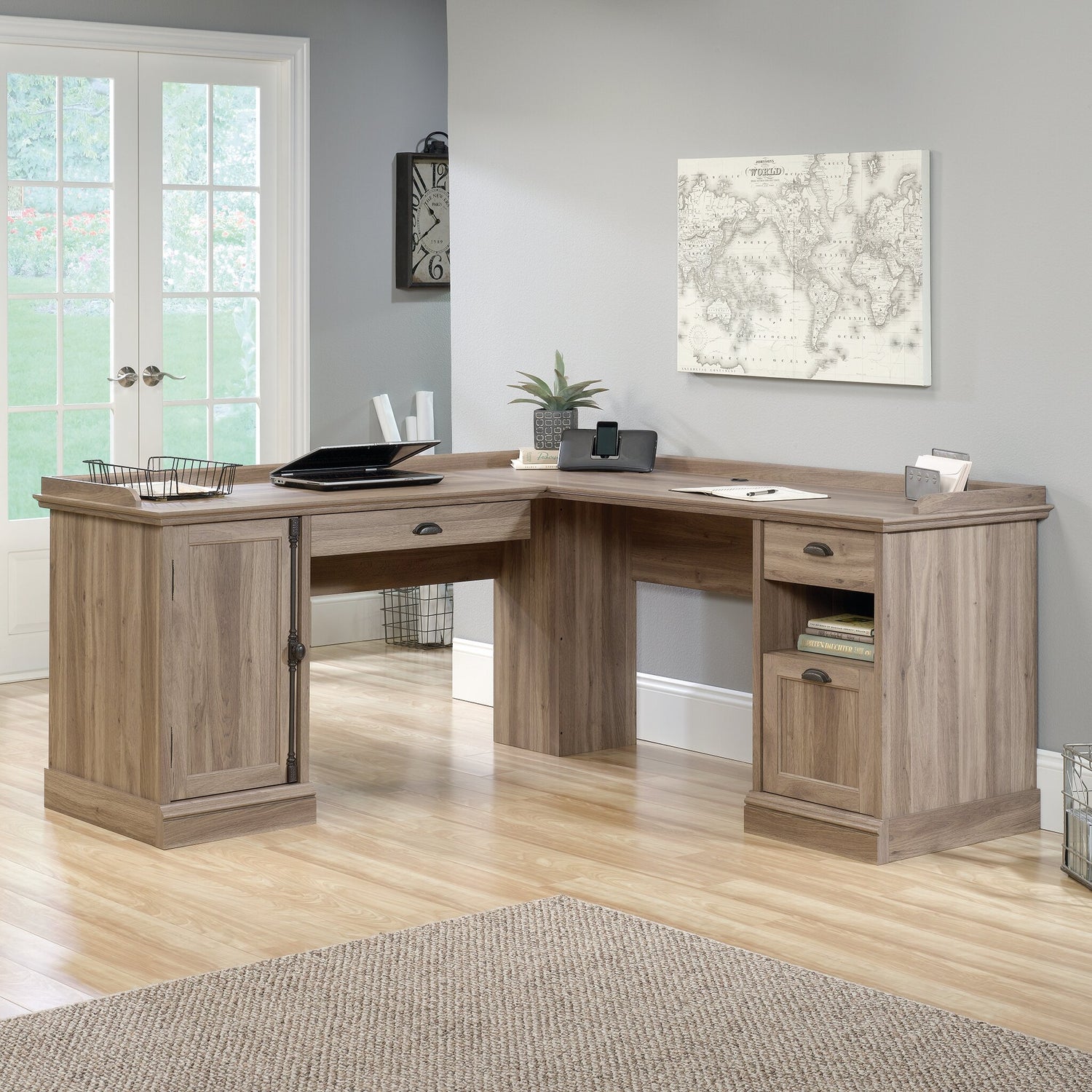 Country roots add beauty to this Barrister Lane L-shaped desk. Made from sturdy engineered wood, this desk easily supports your work setup. Grommet holes in the desktop keep cables from your monitor and computer tidy and untangled. A cabinet door hides your computer tower, while an additional adjustable shelf behind the door keeps your router tucked out of sight. File important papers in the bottom drawer, and keep your stationery essentials organized in the other two drawers. Designed to fit nicely into a corner, this L-shaped desk has plenty of space to make your office work for you.